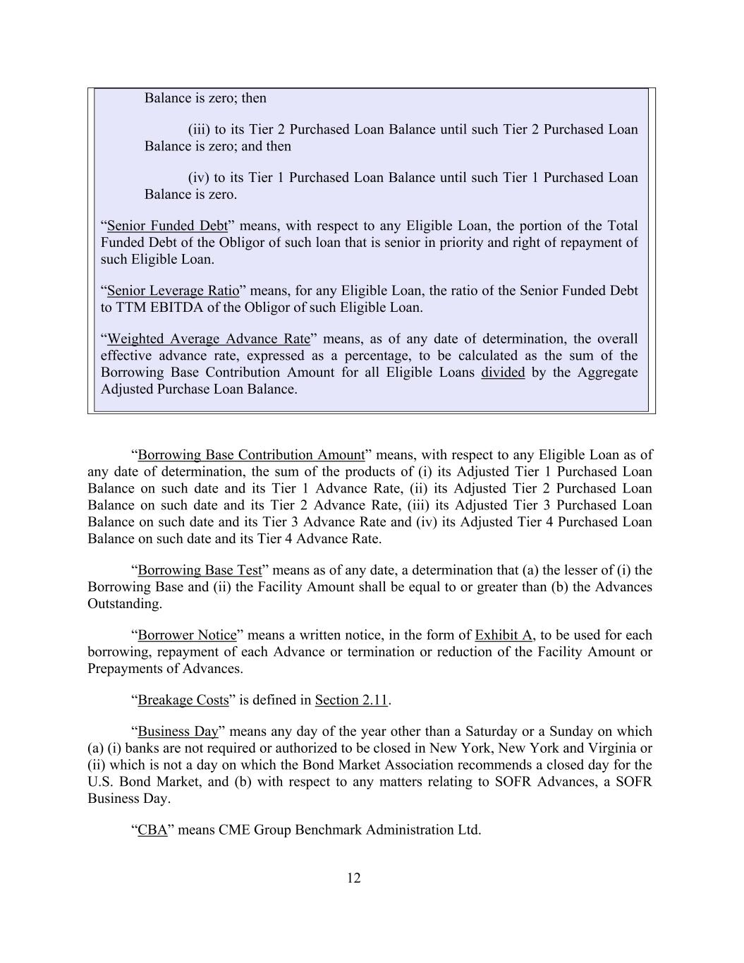 12 “Borrowing Base Contribution Amount” means, with respect to any Eligible Loan as of any date of determination, the sum of the products of (i) its Adjusted Tier 1 Purchased Loan Balance on such date and its Tier 1 Advance Rate, (ii) its Adjusted Tier 2 Purchased Loan Balance on such date and its Tier 2 Advance Rate, (iii) its Adjusted Tier 3 Purchased Loan Balance on such date and its Tier 3 Advance Rate and (iv) its Adjusted Tier 4 Purchased Loan Balance on such date and its Tier 4 Advance Rate. “Borrowing Base Test” means as of any date, a determination that (a) the lesser of (i) the Borrowing Base and (ii) the Facility Amount shall be equal to or greater than (b) the Advances Outstanding. “Borrower Notice” means a written notice, in the form of Exhibit A, to be used for each borrowing, repayment of each Advance or termination or reduction of the Facility Amount or Prepayments of Advances. “Breakage Costs” is defined in Section 2.11. “Business Day” means any day of the year other than a Saturday or a Sunday on which (a) (i) banks are not required or authorized to be closed in New York, New York and Virginia or (ii) which is not a day on which the Bond Market Association recommends a closed day for the U.S. Bond Market, and (b) with respect to any matters relating to SOFR Advances, a SOFR Business Day. “CBA” means CME Group Benchmark Administration Ltd. Balance is zero; then (iii) to its Tier 2 Purchased Loan Balance until such Tier 2 Purchased Loan Balance is zero; and then (iv) to its Tier 1 Purchased Loan Balance until such Tier 1 Purchased Loan Balance is zero. “Senior Funded Debt” means, with respect to any Eligible Loan, the portion of the Total Funded Debt of the Obligor of such loan that is senior in priority and right of repayment of such Eligible Loan. “Senior Leverage Ratio” means, for any Eligible Loan, the ratio of the Senior Funded Debt to TTM EBITDA of the Obligor of such Eligible Loan. “Weighted Average Advance Rate” means, as of any date of determination, the overall effective advance rate, expressed as a percentage, to be calculated as the sum of the Borrowing Base Contribution Amount for all Eligible Loans divided by the Aggregate Adjusted Purchase Loan Balance.