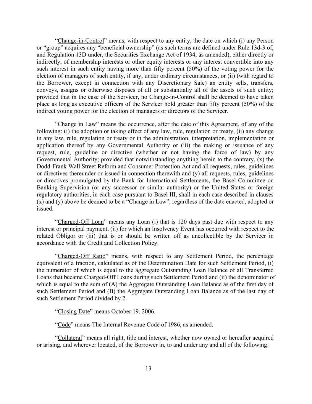 “Change-in-Control” means, with respect to any entity, the date on which (i) any Person or “group” acquires any “beneficial ownership” (as such terms are defined under Rule 13d-3 of, and Regulation 13D under, the Securities Exchange Act of 1934, as amended), either directly or indirectly, of membership interests or other equity interests or any interest convertible into any such interest in such entity having more than fifty percent (50%) of the voting power for the election of managers of such entity, if any, under ordinary circumstances, or (ii) (with regard to the Borrower, except in connection with any Discretionary Sale) an entity sells, transfers, conveys, assigns or otherwise disposes of all or substantially all of the assets of such entity; provided that in the case of the Servicer, no Change-in-Control shall be deemed to have taken place as long as executive officers of the Servicer hold greater than fifty percent (50%) of the indirect voting power for the election of managers or directors of the Servicer. “Change in Law” means the occurrence, after the date of this Agreement, of any of the following: (i) the adoption or taking effect of any law, rule, regulation or treaty, (ii) any change in any law, rule, regulation or treaty or in the administration, interpretation, implementation or application thereof by any Governmental Authority or (iii) the making or issuance of any request, rule, guideline or directive (whether or not having the force of law) by any Governmental Authority; provided that notwithstanding anything herein to the contrary, (x) the Dodd-Frank Wall Street Reform and Consumer Protection Act and all requests, rules, guidelines or directives thereunder or issued in connection therewith and (y) all requests, rules, guidelines or directives promulgated by the Bank for International Settlements, the Basel Committee on Banking Supervision (or any successor or similar authority) or the United States or foreign regulatory authorities, in each case pursuant to Basel III, shall in each case described in clauses (x) and (y) above be deemed to be a “Change in Law”, regardless of the date enacted, adopted or issued. “Charged-Off Loan” means any Loan (i) that is 120 days past due with respect to any interest or principal payment, (ii) for which an Insolvency Event has occurred with respect to the related Obligor or (iii) that is or should be written off as uncollectible by the Servicer in accordance with the Credit and Collection Policy. “Charged-Off Ratio” means, with respect to any Settlement Period, the percentage equivalent of a fraction, calculated as of the Determination Date for such Settlement Period, (i) the numerator of which is equal to the aggregate Outstanding Loan Balance of all Transferred Loans that became Charged-Off Loans during such Settlement Period and (ii) the denominator of which is equal to the sum of (A) the Aggregate Outstanding Loan Balance as of the first day of such Settlement Period and (B) the Aggregate Outstanding Loan Balance as of the last day of such Settlement Period divided by 2. “Closing Date” means October 19, 2006. “Code” means The Internal Revenue Code of 1986, as amended. “Collateral” means all right, title and interest, whether now owned or hereafter acquired or arising, and wherever located, of the Borrower in, to and under any and all of the following: 13