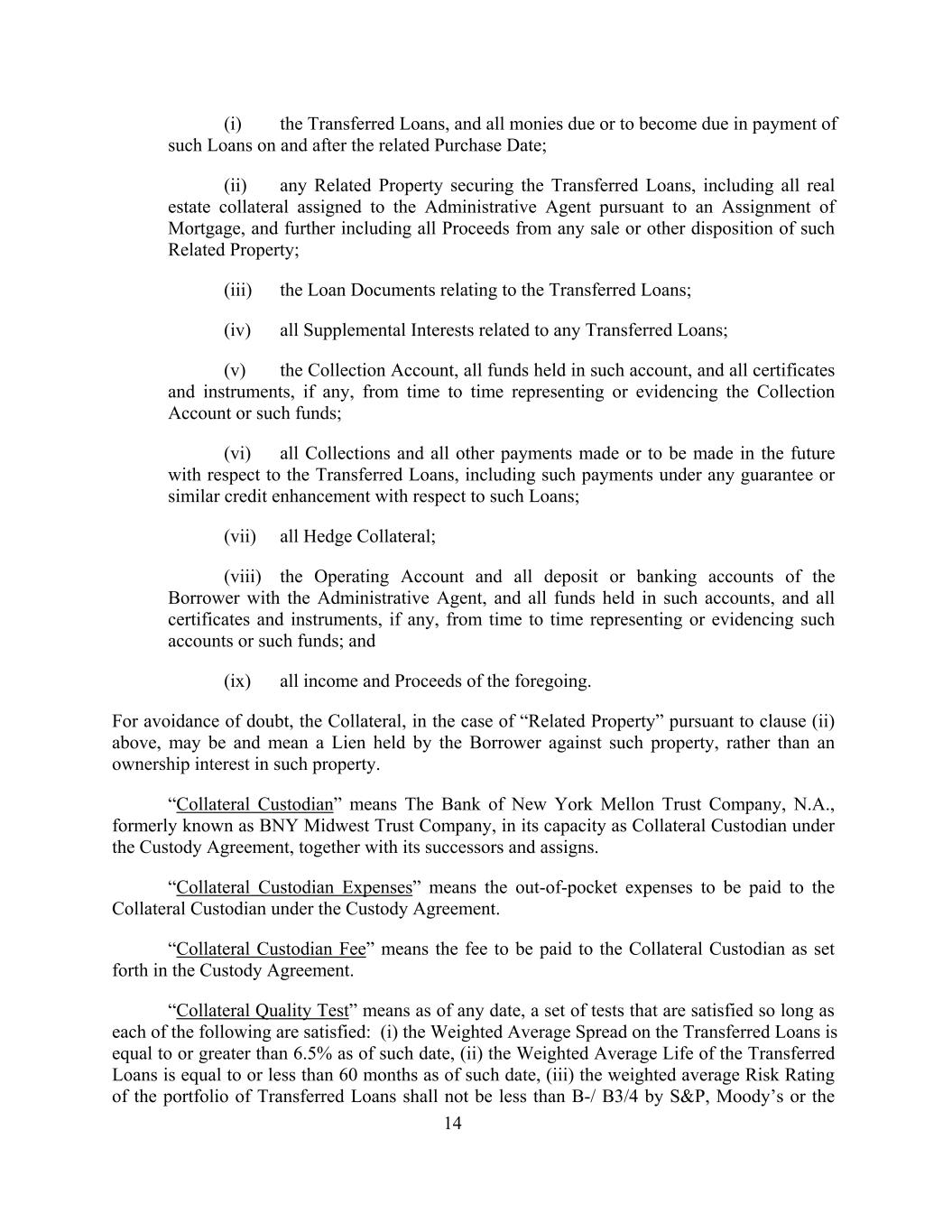(i) the Transferred Loans, and all monies due or to become due in payment of such Loans on and after the related Purchase Date; (ii) any Related Property securing the Transferred Loans, including all real estate collateral assigned to the Administrative Agent pursuant to an Assignment of Mortgage, and further including all Proceeds from any sale or other disposition of such Related Property; (iii) the Loan Documents relating to the Transferred Loans; (iv) all Supplemental Interests related to any Transferred Loans; (v) the Collection Account, all funds held in such account, and all certificates and instruments, if any, from time to time representing or evidencing the Collection Account or such funds; (vi) all Collections and all other payments made or to be made in the future with respect to the Transferred Loans, including such payments under any guarantee or similar credit enhancement with respect to such Loans; (vii) all Hedge Collateral; (viii) the Operating Account and all deposit or banking accounts of the Borrower with the Administrative Agent, and all funds held in such accounts, and all certificates and instruments, if any, from time to time representing or evidencing such accounts or such funds; and (ix) all income and Proceeds of the foregoing. For avoidance of doubt, the Collateral, in the case of “Related Property” pursuant to clause (ii) above, may be and mean a Lien held by the Borrower against such property, rather than an ownership interest in such property. “Collateral Custodian” means The Bank of New York Mellon Trust Company, N.A., formerly known as BNY Midwest Trust Company, in its capacity as Collateral Custodian under the Custody Agreement, together with its successors and assigns. “Collateral Custodian Expenses” means the out-of-pocket expenses to be paid to the Collateral Custodian under the Custody Agreement. “Collateral Custodian Fee” means the fee to be paid to the Collateral Custodian as set forth in the Custody Agreement. “Collateral Quality Test” means as of any date, a set of tests that are satisfied so long as each of the following are satisfied: (i) the Weighted Average Spread on the Transferred Loans is equal to or greater than 6.5% as of such date, (ii) the Weighted Average Life of the Transferred Loans is equal to or less than 60 months as of such date, (iii) the weighted average Risk Rating of the portfolio of Transferred Loans shall not be less than B-/ B3/4 by S&P, Moody’s or the 14