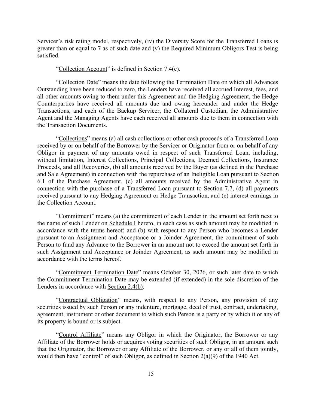 Servicer’s risk rating model, respectively, (iv) the Diversity Score for the Transferred Loans is greater than or equal to 7 as of such date and (v) the Required Minimum Obligors Test is being satisfied. “Collection Account” is defined in Section 7.4(e). “Collection Date” means the date following the Termination Date on which all Advances Outstanding have been reduced to zero, the Lenders have received all accrued Interest, fees, and all other amounts owing to them under this Agreement and the Hedging Agreement, the Hedge Counterparties have received all amounts due and owing hereunder and under the Hedge Transactions, and each of the Backup Servicer, the Collateral Custodian, the Administrative Agent and the Managing Agents have each received all amounts due to them in connection with the Transaction Documents. “Collections” means (a) all cash collections or other cash proceeds of a Transferred Loan received by or on behalf of the Borrower by the Servicer or Originator from or on behalf of any Obligor in payment of any amounts owed in respect of such Transferred Loan, including, without limitation, Interest Collections, Principal Collections, Deemed Collections, Insurance Proceeds, and all Recoveries, (b) all amounts received by the Buyer (as defined in the Purchase and Sale Agreement) in connection with the repurchase of an Ineligible Loan pursuant to Section 6.1 of the Purchase Agreement, (c) all amounts received by the Administrative Agent in connection with the purchase of a Transferred Loan pursuant to Section 7.7, (d) all payments received pursuant to any Hedging Agreement or Hedge Transaction, and (e) interest earnings in the Collection Account. “Commitment” means (a) the commitment of each Lender in the amount set forth next to the name of such Lender on Schedule I hereto, in each case as such amount may be modified in accordance with the terms hereof; and (b) with respect to any Person who becomes a Lender pursuant to an Assignment and Acceptance or a Joinder Agreement, the commitment of such Person to fund any Advance to the Borrower in an amount not to exceed the amount set forth in such Assignment and Acceptance or Joinder Agreement, as such amount may be modified in accordance with the terms hereof. “Commitment Termination Date” means October 30, 2026, or such later date to which the Commitment Termination Date may be extended (if extended) in the sole discretion of the Lenders in accordance with Section 2.4(b). “Contractual Obligation” means, with respect to any Person, any provision of any securities issued by such Person or any indenture, mortgage, deed of trust, contract, undertaking, agreement, instrument or other document to which such Person is a party or by which it or any of its property is bound or is subject. “Control Affiliate” means any Obligor in which the Originator, the Borrower or any Affiliate of the Borrower holds or acquires voting securities of such Obligor, in an amount such that the Originator, the Borrower or any Affiliate of the Borrower, or any or all of them jointly, would then have “control” of such Obligor, as defined in Section 2(a)(9) of the 1940 Act. 15
