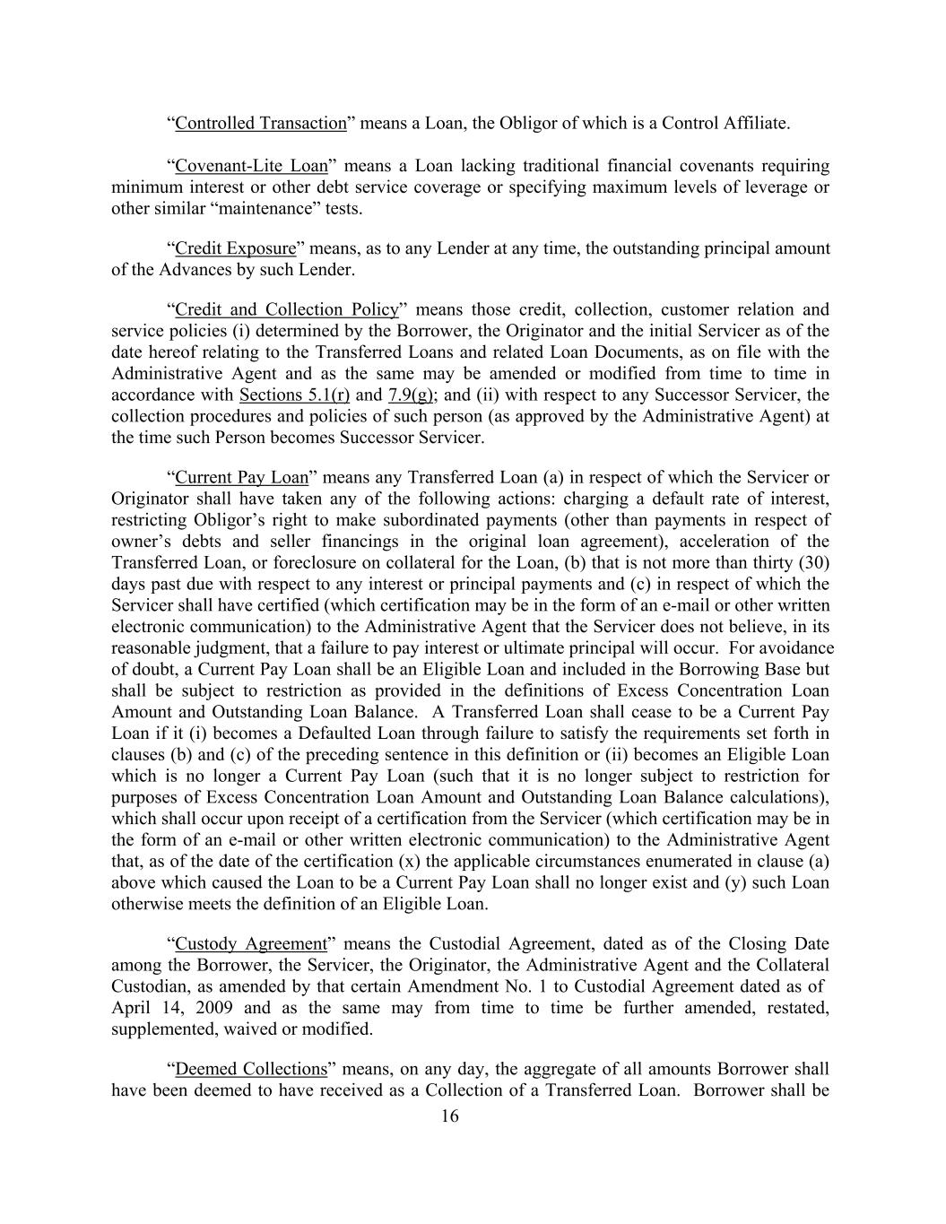 “Controlled Transaction” means a Loan, the Obligor of which is a Control Affiliate. “Covenant-Lite Loan” means a Loan lacking traditional financial covenants requiring minimum interest or other debt service coverage or specifying maximum levels of leverage or other similar “maintenance” tests. “Credit Exposure” means, as to any Lender at any time, the outstanding principal amount of the Advances by such Lender. “Credit and Collection Policy” means those credit, collection, customer relation and service policies (i) determined by the Borrower, the Originator and the initial Servicer as of the date hereof relating to the Transferred Loans and related Loan Documents, as on file with the Administrative Agent and as the same may be amended or modified from time to time in accordance with Sections 5.1(r) and 7.9(g); and (ii) with respect to any Successor Servicer, the collection procedures and policies of such person (as approved by the Administrative Agent) at the time such Person becomes Successor Servicer. “Current Pay Loan” means any Transferred Loan (a) in respect of which the Servicer or Originator shall have taken any of the following actions: charging a default rate of interest, restricting Obligor’s right to make subordinated payments (other than payments in respect of owner’s debts and seller financings in the original loan agreement), acceleration of the Transferred Loan, or foreclosure on collateral for the Loan, (b) that is not more than thirty (30) days past due with respect to any interest or principal payments and (c) in respect of which the Servicer shall have certified (which certification may be in the form of an e-mail or other written electronic communication) to the Administrative Agent that the Servicer does not believe, in its reasonable judgment, that a failure to pay interest or ultimate principal will occur. For avoidance of doubt, a Current Pay Loan shall be an Eligible Loan and included in the Borrowing Base but shall be subject to restriction as provided in the definitions of Excess Concentration Loan Amount and Outstanding Loan Balance. A Transferred Loan shall cease to be a Current Pay Loan if it (i) becomes a Defaulted Loan through failure to satisfy the requirements set forth in clauses (b) and (c) of the preceding sentence in this definition or (ii) becomes an Eligible Loan which is no longer a Current Pay Loan (such that it is no longer subject to restriction for purposes of Excess Concentration Loan Amount and Outstanding Loan Balance calculations), which shall occur upon receipt of a certification from the Servicer (which certification may be in the form of an e-mail or other written electronic communication) to the Administrative Agent that, as of the date of the certification (x) the applicable circumstances enumerated in clause (a) above which caused the Loan to be a Current Pay Loan shall no longer exist and (y) such Loan otherwise meets the definition of an Eligible Loan. “Custody Agreement” means the Custodial Agreement, dated as of the Closing Date among the Borrower, the Servicer, the Originator, the Administrative Agent and the Collateral Custodian, as amended by that certain Amendment No. 1 to Custodial Agreement dated as of April 14, 2009 and as the same may from time to time be further amended, restated, supplemented, waived or modified. “Deemed Collections” means, on any day, the aggregate of all amounts Borrower shall have been deemed to have received as a Collection of a Transferred Loan. Borrower shall be 16