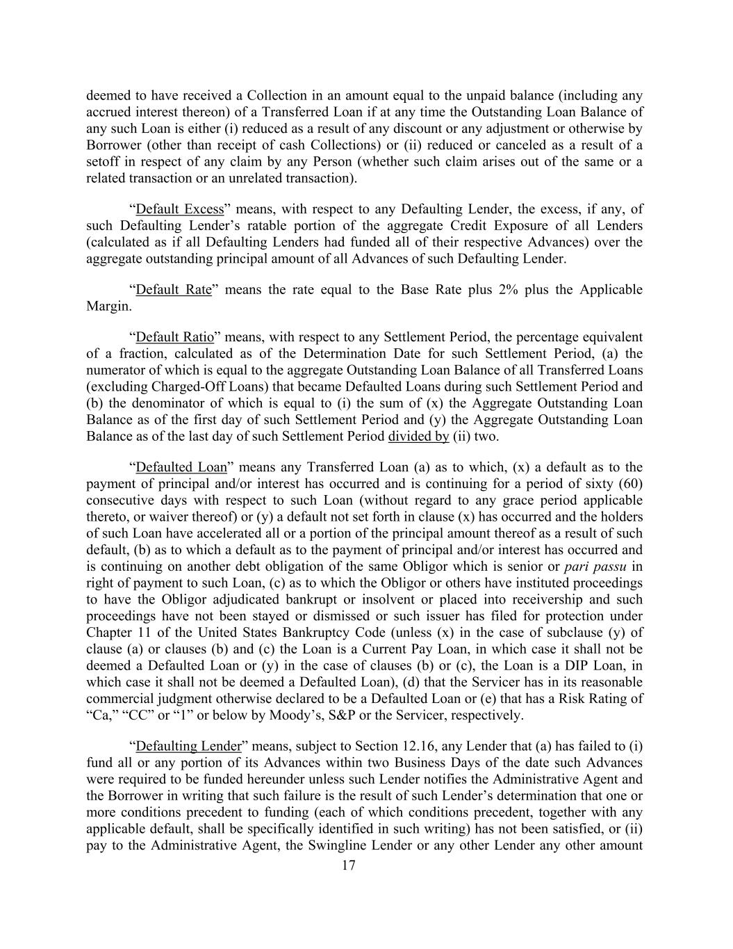 deemed to have received a Collection in an amount equal to the unpaid balance (including any accrued interest thereon) of a Transferred Loan if at any time the Outstanding Loan Balance of any such Loan is either (i) reduced as a result of any discount or any adjustment or otherwise by Borrower (other than receipt of cash Collections) or (ii) reduced or canceled as a result of a setoff in respect of any claim by any Person (whether such claim arises out of the same or a related transaction or an unrelated transaction). “Default Excess” means, with respect to any Defaulting Lender, the excess, if any, of such Defaulting Lender’s ratable portion of the aggregate Credit Exposure of all Lenders (calculated as if all Defaulting Lenders had funded all of their respective Advances) over the aggregate outstanding principal amount of all Advances of such Defaulting Lender. “Default Rate” means the rate equal to the Base Rate plus 2% plus the Applicable Margin. “Default Ratio” means, with respect to any Settlement Period, the percentage equivalent of a fraction, calculated as of the Determination Date for such Settlement Period, (a) the numerator of which is equal to the aggregate Outstanding Loan Balance of all Transferred Loans (excluding Charged-Off Loans) that became Defaulted Loans during such Settlement Period and (b) the denominator of which is equal to (i) the sum of (x) the Aggregate Outstanding Loan Balance as of the first day of such Settlement Period and (y) the Aggregate Outstanding Loan Balance as of the last day of such Settlement Period divided by (ii) two. “Defaulted Loan” means any Transferred Loan (a) as to which, (x) a default as to the payment of principal and/or interest has occurred and is continuing for a period of sixty (60) consecutive days with respect to such Loan (without regard to any grace period applicable thereto, or waiver thereof) or (y) a default not set forth in clause (x) has occurred and the holders of such Loan have accelerated all or a portion of the principal amount thereof as a result of such default, (b) as to which a default as to the payment of principal and/or interest has occurred and is continuing on another debt obligation of the same Obligor which is senior or pari passu in right of payment to such Loan, (c) as to which the Obligor or others have instituted proceedings to have the Obligor adjudicated bankrupt or insolvent or placed into receivership and such proceedings have not been stayed or dismissed or such issuer has filed for protection under Chapter 11 of the United States Bankruptcy Code (unless (x) in the case of subclause (y) of clause (a) or clauses (b) and (c) the Loan is a Current Pay Loan, in which case it shall not be deemed a Defaulted Loan or (y) in the case of clauses (b) or (c), the Loan is a DIP Loan, in which case it shall not be deemed a Defaulted Loan), (d) that the Servicer has in its reasonable commercial judgment otherwise declared to be a Defaulted Loan or (e) that has a Risk Rating of “Ca,” “CC” or “1” or below by Moody’s, S&P or the Servicer, respectively. “Defaulting Lender” means, subject to Section 12.16, any Lender that (a) has failed to (i) fund all or any portion of its Advances within two Business Days of the date such Advances were required to be funded hereunder unless such Lender notifies the Administrative Agent and the Borrower in writing that such failure is the result of such Lender’s determination that one or more conditions precedent to funding (each of which conditions precedent, together with any applicable default, shall be specifically identified in such writing) has not been satisfied, or (ii) pay to the Administrative Agent, the Swingline Lender or any other Lender any other amount 17