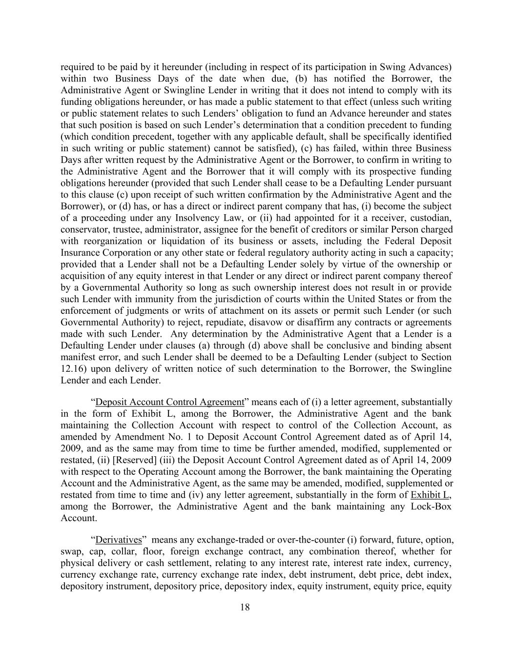 required to be paid by it hereunder (including in respect of its participation in Swing Advances) within two Business Days of the date when due, (b) has notified the Borrower, the Administrative Agent or Swingline Lender in writing that it does not intend to comply with its funding obligations hereunder, or has made a public statement to that effect (unless such writing or public statement relates to such Lenders’ obligation to fund an Advance hereunder and states that such position is based on such Lender’s determination that a condition precedent to funding (which condition precedent, together with any applicable default, shall be specifically identified in such writing or public statement) cannot be satisfied), (c) has failed, within three Business Days after written request by the Administrative Agent or the Borrower, to confirm in writing to the Administrative Agent and the Borrower that it will comply with its prospective funding obligations hereunder (provided that such Lender shall cease to be a Defaulting Lender pursuant to this clause (c) upon receipt of such written confirmation by the Administrative Agent and the Borrower), or (d) has, or has a direct or indirect parent company that has, (i) become the subject of a proceeding under any Insolvency Law, or (ii) had appointed for it a receiver, custodian, conservator, trustee, administrator, assignee for the benefit of creditors or similar Person charged with reorganization or liquidation of its business or assets, including the Federal Deposit Insurance Corporation or any other state or federal regulatory authority acting in such a capacity; provided that a Lender shall not be a Defaulting Lender solely by virtue of the ownership or acquisition of any equity interest in that Lender or any direct or indirect parent company thereof by a Governmental Authority so long as such ownership interest does not result in or provide such Lender with immunity from the jurisdiction of courts within the United States or from the enforcement of judgments or writs of attachment on its assets or permit such Lender (or such Governmental Authority) to reject, repudiate, disavow or disaffirm any contracts or agreements made with such Lender. Any determination by the Administrative Agent that a Lender is a Defaulting Lender under clauses (a) through (d) above shall be conclusive and binding absent manifest error, and such Lender shall be deemed to be a Defaulting Lender (subject to Section 12.16) upon delivery of written notice of such determination to the Borrower, the Swingline Lender and each Lender. “Deposit Account Control Agreement” means each of (i) a letter agreement, substantially in the form of Exhibit L, among the Borrower, the Administrative Agent and the bank maintaining the Collection Account with respect to control of the Collection Account, as amended by Amendment No. 1 to Deposit Account Control Agreement dated as of April 14, 2009, and as the same may from time to time be further amended, modified, supplemented or restated, (ii) [Reserved] (iii) the Deposit Account Control Agreement dated as of April 14, 2009 with respect to the Operating Account among the Borrower, the bank maintaining the Operating Account and the Administrative Agent, as the same may be amended, modified, supplemented or restated from time to time and (iv) any letter agreement, substantially in the form of Exhibit L, among the Borrower, the Administrative Agent and the bank maintaining any Lock-Box Account. “Derivatives” means any exchange-traded or over-the-counter (i) forward, future, option, swap, cap, collar, floor, foreign exchange contract, any combination thereof, whether for physical delivery or cash settlement, relating to any interest rate, interest rate index, currency, currency exchange rate, currency exchange rate index, debt instrument, debt price, debt index, depository instrument, depository price, depository index, equity instrument, equity price, equity 18