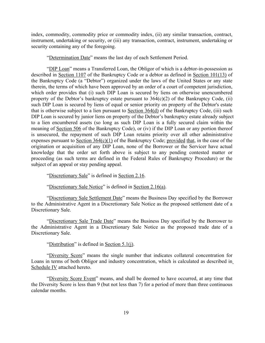 index, commodity, commodity price or commodity index, (ii) any similar transaction, contract, instrument, undertaking or security, or (iii) any transaction, contract, instrument, undertaking or security containing any of the foregoing. “Determination Date” means the last day of each Settlement Period. “DIP Loan” means a Transferred Loan, the Obligor of which is a debtor-in-possession as described in Section 1107 of the Bankruptcy Code or a debtor as defined in Section 101(13) of the Bankruptcy Code (a “Debtor”) organized under the laws of the United States or any state therein, the terms of which have been approved by an order of a court of competent jurisdiction, which order provides that (i) such DIP Loan is secured by liens on otherwise unencumbered property of the Debtor’s bankruptcy estate pursuant to 364(c)(2) of the Bankruptcy Code, (ii) such DIP Loan is secured by liens of equal or senior priority on property of the Debtor's estate that is otherwise subject to a lien pursuant to Section 364(d) of the Bankruptcy Code, (iii) such DIP Loan is secured by junior liens on property of the Debtor’s bankruptcy estate already subject to a lien encumbered assets (so long as such DIP Loan is a fully secured claim within the meaning of Section 506 of the Bankruptcy Code), or (iv) if the DIP Loan or any portion thereof is unsecured, the repayment of such DIP Loan retains priority over all other administrative expenses pursuant to Section 364(c)(1) of the Bankruptcy Code; provided that, in the case of the origination or acquisition of any DIP Loan, none of the Borrower or the Servicer have actual knowledge that the order set forth above is subject to any pending contested matter or proceeding (as such terms are defined in the Federal Rules of Bankruptcy Procedure) or the subject of an appeal or stay pending appeal. “Discretionary Sale” is defined in Section 2.16. “Discretionary Sale Notice” is defined in Section 2.16(a). “Discretionary Sale Settlement Date” means the Business Day specified by the Borrower to the Administrative Agent in a Discretionary Sale Notice as the proposed settlement date of a Discretionary Sale. “Discretionary Sale Trade Date” means the Business Day specified by the Borrower to the Administrative Agent in a Discretionary Sale Notice as the proposed trade date of a Discretionary Sale. “Distribution” is defined in Section 5.1(j). “Diversity Score” means the single number that indicates collateral concentration for Loans in terms of both Obligor and industry concentration, which is calculated as described in Schedule IV attached hereto. “Diversity Score Event” means, and shall be deemed to have occurred, at any time that the Diversity Score is less than 9 (but not less than 7) for a period of more than three continuous calendar months. 19
