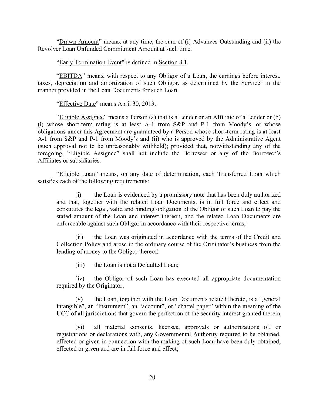 “Drawn Amount” means, at any time, the sum of (i) Advances Outstanding and (ii) the Revolver Loan Unfunded Commitment Amount at such time. “Early Termination Event” is defined in Section 8.1. “EBITDA” means, with respect to any Obligor of a Loan, the earnings before interest, taxes, depreciation and amortization of such Obligor, as determined by the Servicer in the manner provided in the Loan Documents for such Loan. “Effective Date” means April 30, 2013. “Eligible Assignee” means a Person (a) that is a Lender or an Affiliate of a Lender or (b) (i) whose short-term rating is at least A-1 from S&P and P-1 from Moody’s, or whose obligations under this Agreement are guaranteed by a Person whose short-term rating is at least A-1 from S&P and P-1 from Moody’s and (ii) who is approved by the Administrative Agent (such approval not to be unreasonably withheld); provided that, notwithstanding any of the foregoing, “Eligible Assignee” shall not include the Borrower or any of the Borrower’s Affiliates or subsidiaries. “Eligible Loan” means, on any date of determination, each Transferred Loan which satisfies each of the following requirements: (i) the Loan is evidenced by a promissory note that has been duly authorized and that, together with the related Loan Documents, is in full force and effect and constitutes the legal, valid and binding obligation of the Obligor of such Loan to pay the stated amount of the Loan and interest thereon, and the related Loan Documents are enforceable against such Obligor in accordance with their respective terms; (ii) the Loan was originated in accordance with the terms of the Credit and Collection Policy and arose in the ordinary course of the Originator’s business from the lending of money to the Obligor thereof; (iii) the Loan is not a Defaulted Loan; (iv) the Obligor of such Loan has executed all appropriate documentation required by the Originator; (v) the Loan, together with the Loan Documents related thereto, is a “general intangible”, an “instrument”, an “account”, or “chattel paper” within the meaning of the UCC of all jurisdictions that govern the perfection of the security interest granted therein; (vi) all material consents, licenses, approvals or authorizations of, or registrations or declarations with, any Governmental Authority required to be obtained, effected or given in connection with the making of such Loan have been duly obtained, effected or given and are in full force and effect; 20