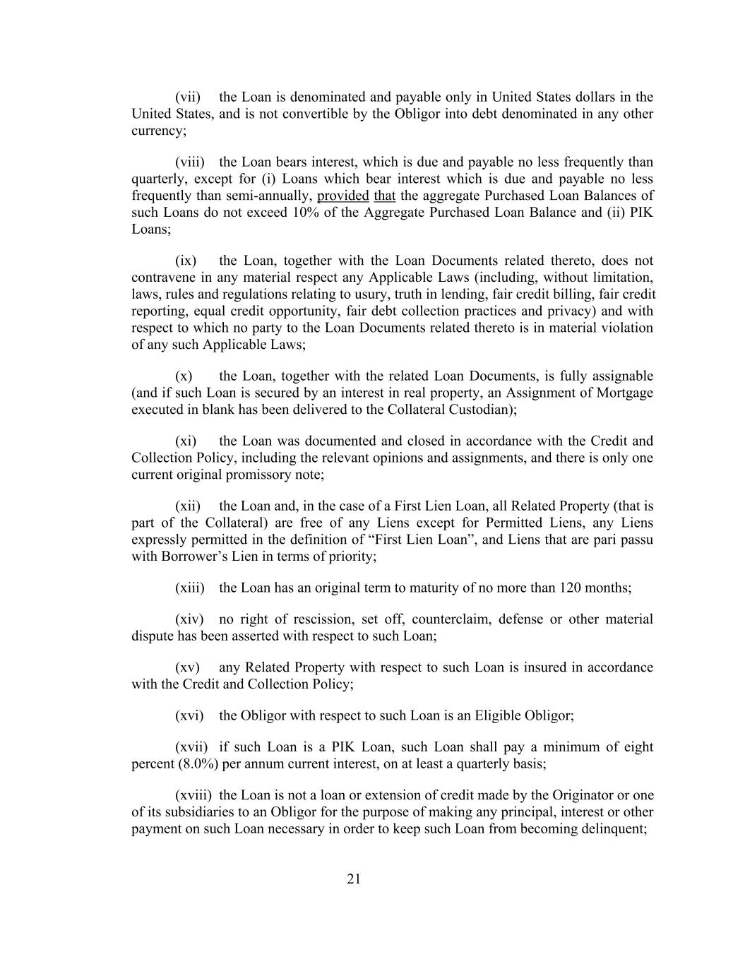 (vii) the Loan is denominated and payable only in United States dollars in the United States, and is not convertible by the Obligor into debt denominated in any other currency; (viii) the Loan bears interest, which is due and payable no less frequently than quarterly, except for (i) Loans which bear interest which is due and payable no less frequently than semi-annually, provided that the aggregate Purchased Loan Balances of such Loans do not exceed 10% of the Aggregate Purchased Loan Balance and (ii) PIK Loans; (ix) the Loan, together with the Loan Documents related thereto, does not contravene in any material respect any Applicable Laws (including, without limitation, laws, rules and regulations relating to usury, truth in lending, fair credit billing, fair credit reporting, equal credit opportunity, fair debt collection practices and privacy) and with respect to which no party to the Loan Documents related thereto is in material violation of any such Applicable Laws; (x) the Loan, together with the related Loan Documents, is fully assignable (and if such Loan is secured by an interest in real property, an Assignment of Mortgage executed in blank has been delivered to the Collateral Custodian); (xi) the Loan was documented and closed in accordance with the Credit and Collection Policy, including the relevant opinions and assignments, and there is only one current original promissory note; (xii) the Loan and, in the case of a First Lien Loan, all Related Property (that is part of the Collateral) are free of any Liens except for Permitted Liens, any Liens expressly permitted in the definition of “First Lien Loan”, and Liens that are pari passu with Borrower’s Lien in terms of priority; (xiii) the Loan has an original term to maturity of no more than 120 months; (xiv) no right of rescission, set off, counterclaim, defense or other material dispute has been asserted with respect to such Loan; (xv) any Related Property with respect to such Loan is insured in accordance with the Credit and Collection Policy; (xvi) the Obligor with respect to such Loan is an Eligible Obligor; (xvii) if such Loan is a PIK Loan, such Loan shall pay a minimum of eight percent (8.0%) per annum current interest, on at least a quarterly basis; (xviii) the Loan is not a loan or extension of credit made by the Originator or one of its subsidiaries to an Obligor for the purpose of making any principal, interest or other payment on such Loan necessary in order to keep such Loan from becoming delinquent; 21