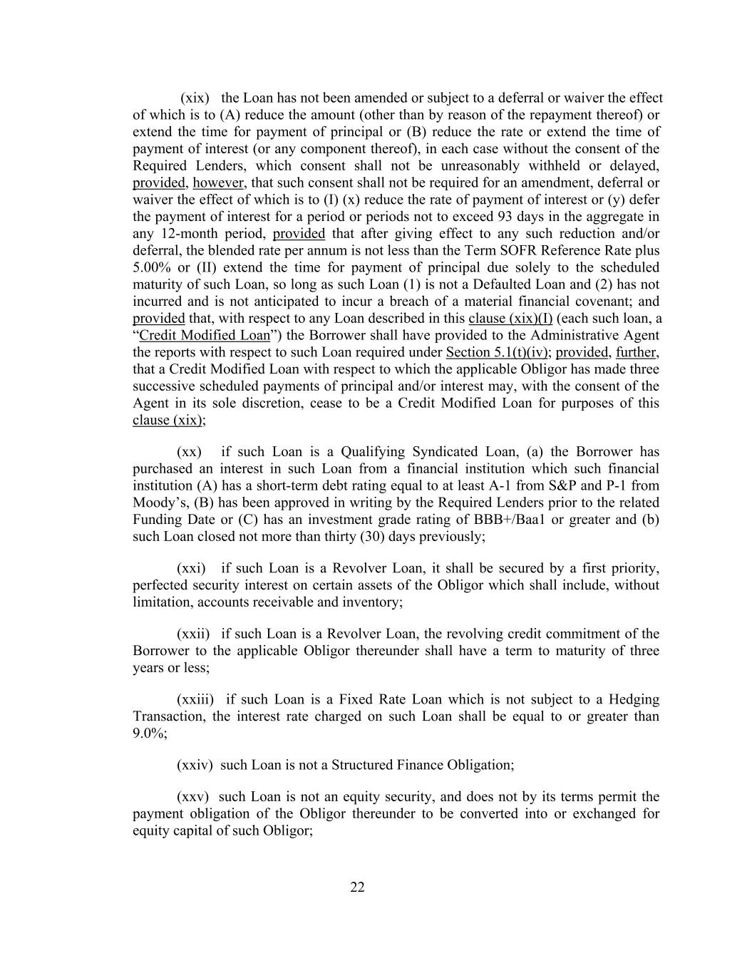 (xix) the Loan has not been amended or subject to a deferral or waiver the effect of which is to (A) reduce the amount (other than by reason of the repayment thereof) or extend the time for payment of principal or (B) reduce the rate or extend the time of payment of interest (or any component thereof), in each case without the consent of the Required Lenders, which consent shall not be unreasonably withheld or delayed, provided, however, that such consent shall not be required for an amendment, deferral or waiver the effect of which is to (I) (x) reduce the rate of payment of interest or (y) defer the payment of interest for a period or periods not to exceed 93 days in the aggregate in any 12-month period, provided that after giving effect to any such reduction and/or deferral, the blended rate per annum is not less than the Term SOFR Reference Rate plus 5.00% or (II) extend the time for payment of principal due solely to the scheduled maturity of such Loan, so long as such Loan (1) is not a Defaulted Loan and (2) has not incurred and is not anticipated to incur a breach of a material financial covenant; and provided that, with respect to any Loan described in this clause (xix)(I) (each such loan, a “Credit Modified Loan”) the Borrower shall have provided to the Administrative Agent the reports with respect to such Loan required under Section 5.1(t)(iv); provided, further, that a Credit Modified Loan with respect to which the applicable Obligor has made three successive scheduled payments of principal and/or interest may, with the consent of the Agent in its sole discretion, cease to be a Credit Modified Loan for purposes of this clause (xix); (xx) if such Loan is a Qualifying Syndicated Loan, (a) the Borrower has purchased an interest in such Loan from a financial institution which such financial institution (A) has a short-term debt rating equal to at least A-1 from S&P and P-1 from Moody’s, (B) has been approved in writing by the Required Lenders prior to the related Funding Date or (C) has an investment grade rating of BBB+/Baa1 or greater and (b) such Loan closed not more than thirty (30) days previously; (xxi) if such Loan is a Revolver Loan, it shall be secured by a first priority, perfected security interest on certain assets of the Obligor which shall include, without limitation, accounts receivable and inventory; (xxii) if such Loan is a Revolver Loan, the revolving credit commitment of the Borrower to the applicable Obligor thereunder shall have a term to maturity of three years or less; (xxiii) if such Loan is a Fixed Rate Loan which is not subject to a Hedging Transaction, the interest rate charged on such Loan shall be equal to or greater than 9.0%; (xxiv) such Loan is not a Structured Finance Obligation; (xxv) such Loan is not an equity security, and does not by its terms permit the payment obligation of the Obligor thereunder to be converted into or exchanged for equity capital of such Obligor; 22