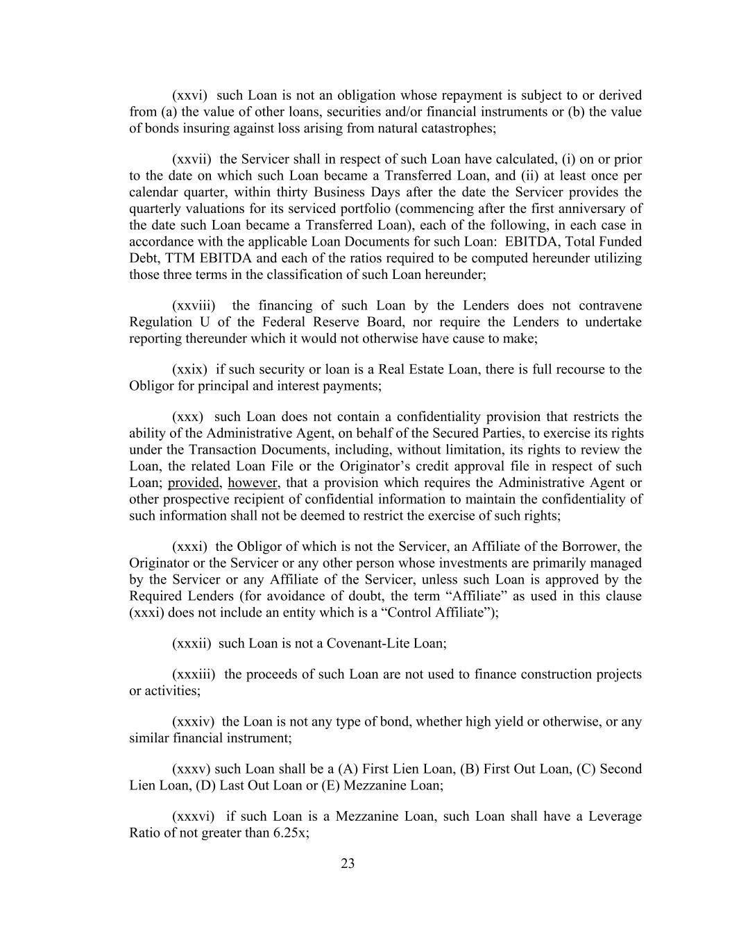 (xxvi) such Loan is not an obligation whose repayment is subject to or derived from (a) the value of other loans, securities and/or financial instruments or (b) the value of bonds insuring against loss arising from natural catastrophes; (xxvii) the Servicer shall in respect of such Loan have calculated, (i) on or prior to the date on which such Loan became a Transferred Loan, and (ii) at least once per calendar quarter, within thirty Business Days after the date the Servicer provides the quarterly valuations for its serviced portfolio (commencing after the first anniversary of the date such Loan became a Transferred Loan), each of the following, in each case in accordance with the applicable Loan Documents for such Loan: EBITDA, Total Funded Debt, TTM EBITDA and each of the ratios required to be computed hereunder utilizing those three terms in the classification of such Loan hereunder; (xxviii) the financing of such Loan by the Lenders does not contravene Regulation U of the Federal Reserve Board, nor require the Lenders to undertake reporting thereunder which it would not otherwise have cause to make; (xxix) if such security or loan is a Real Estate Loan, there is full recourse to the Obligor for principal and interest payments; (xxx) such Loan does not contain a confidentiality provision that restricts the ability of the Administrative Agent, on behalf of the Secured Parties, to exercise its rights under the Transaction Documents, including, without limitation, its rights to review the Loan, the related Loan File or the Originator’s credit approval file in respect of such Loan; provided, however, that a provision which requires the Administrative Agent or other prospective recipient of confidential information to maintain the confidentiality of such information shall not be deemed to restrict the exercise of such rights; (xxxi) the Obligor of which is not the Servicer, an Affiliate of the Borrower, the Originator or the Servicer or any other person whose investments are primarily managed by the Servicer or any Affiliate of the Servicer, unless such Loan is approved by the Required Lenders (for avoidance of doubt, the term “Affiliate” as used in this clause (xxxi) does not include an entity which is a “Control Affiliate”); (xxxii) such Loan is not a Covenant-Lite Loan; (xxxiii) the proceeds of such Loan are not used to finance construction projects or activities; (xxxiv) the Loan is not any type of bond, whether high yield or otherwise, or any similar financial instrument; (xxxv) such Loan shall be a (A) First Lien Loan, (B) First Out Loan, (C) Second Lien Loan, (D) Last Out Loan or (E) Mezzanine Loan; (xxxvi) if such Loan is a Mezzanine Loan, such Loan shall have a Leverage Ratio of not greater than 6.25x; 23