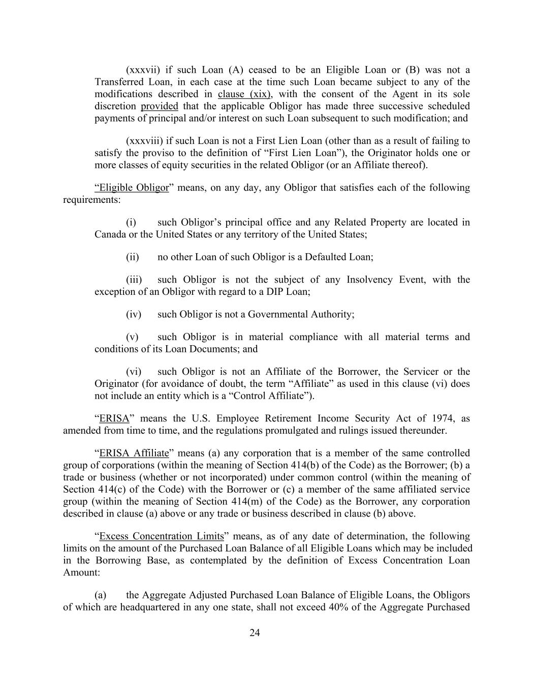(xxxvii) if such Loan (A) ceased to be an Eligible Loan or (B) was not a Transferred Loan, in each case at the time such Loan became subject to any of the modifications described in clause (xix), with the consent of the Agent in its sole discretion provided that the applicable Obligor has made three successive scheduled payments of principal and/or interest on such Loan subsequent to such modification; and (xxxviii) if such Loan is not a First Lien Loan (other than as a result of failing to satisfy the proviso to the definition of “First Lien Loan”), the Originator holds one or more classes of equity securities in the related Obligor (or an Affiliate thereof). “Eligible Obligor” means, on any day, any Obligor that satisfies each of the following requirements: (i) such Obligor’s principal office and any Related Property are located in Canada or the United States or any territory of the United States; (ii) no other Loan of such Obligor is a Defaulted Loan; (iii) such Obligor is not the subject of any Insolvency Event, with the exception of an Obligor with regard to a DIP Loan; (iv) such Obligor is not a Governmental Authority; (v) such Obligor is in material compliance with all material terms and conditions of its Loan Documents; and (vi) such Obligor is not an Affiliate of the Borrower, the Servicer or the Originator (for avoidance of doubt, the term “Affiliate” as used in this clause (vi) does not include an entity which is a “Control Affiliate”). “ERISA” means the U.S. Employee Retirement Income Security Act of 1974, as amended from time to time, and the regulations promulgated and rulings issued thereunder. “ERISA Affiliate” means (a) any corporation that is a member of the same controlled group of corporations (within the meaning of Section 414(b) of the Code) as the Borrower; (b) a trade or business (whether or not incorporated) under common control (within the meaning of Section 414(c) of the Code) with the Borrower or (c) a member of the same affiliated service group (within the meaning of Section 414(m) of the Code) as the Borrower, any corporation described in clause (a) above or any trade or business described in clause (b) above. “Excess Concentration Limits” means, as of any date of determination, the following limits on the amount of the Purchased Loan Balance of all Eligible Loans which may be included in the Borrowing Base, as contemplated by the definition of Excess Concentration Loan Amount: (a) the Aggregate Adjusted Purchased Loan Balance of Eligible Loans, the Obligors of which are headquartered in any one state, shall not exceed 40% of the Aggregate Purchased 24