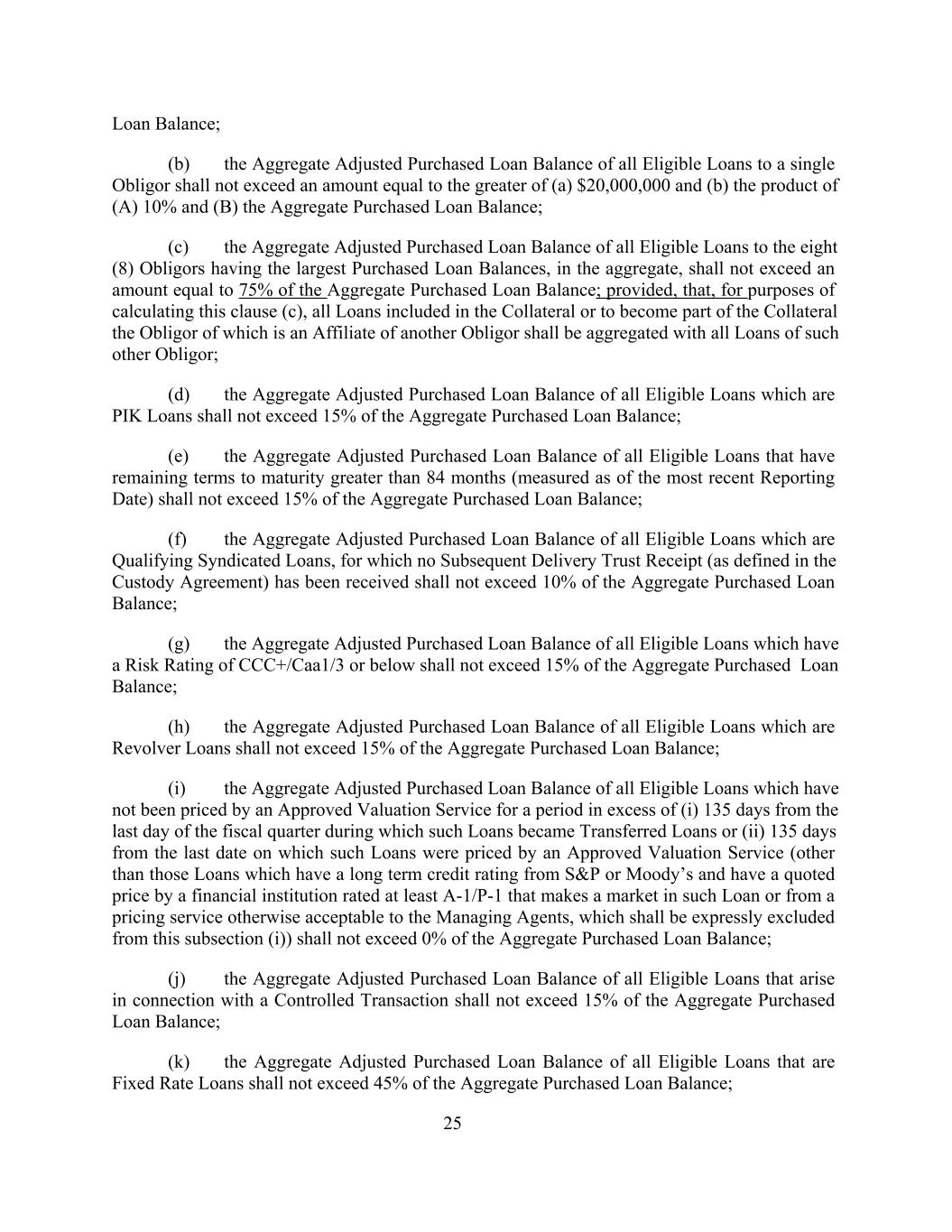 Loan Balance; (b) the Aggregate Adjusted Purchased Loan Balance of all Eligible Loans to a single Obligor shall not exceed an amount equal to the greater of (a) $20,000,000 and (b) the product of (A) 10% and (B) the Aggregate Purchased Loan Balance; (c) the Aggregate Adjusted Purchased Loan Balance of all Eligible Loans to the eight (8) Obligors having the largest Purchased Loan Balances, in the aggregate, shall not exceed an amount equal to 75% of the Aggregate Purchased Loan Balance; provided, that, for purposes of calculating this clause (c), all Loans included in the Collateral or to become part of the Collateral the Obligor of which is an Affiliate of another Obligor shall be aggregated with all Loans of such other Obligor; (d) the Aggregate Adjusted Purchased Loan Balance of all Eligible Loans which are PIK Loans shall not exceed 15% of the Aggregate Purchased Loan Balance; (e) the Aggregate Adjusted Purchased Loan Balance of all Eligible Loans that have remaining terms to maturity greater than 84 months (measured as of the most recent Reporting Date) shall not exceed 15% of the Aggregate Purchased Loan Balance; (f) the Aggregate Adjusted Purchased Loan Balance of all Eligible Loans which are Qualifying Syndicated Loans, for which no Subsequent Delivery Trust Receipt (as defined in the Custody Agreement) has been received shall not exceed 10% of the Aggregate Purchased Loan Balance; (g) the Aggregate Adjusted Purchased Loan Balance of all Eligible Loans which have a Risk Rating of CCC+/Caa1/3 or below shall not exceed 15% of the Aggregate Purchased Loan Balance; (h) the Aggregate Adjusted Purchased Loan Balance of all Eligible Loans which are Revolver Loans shall not exceed 15% of the Aggregate Purchased Loan Balance; (i) the Aggregate Adjusted Purchased Loan Balance of all Eligible Loans which have not been priced by an Approved Valuation Service for a period in excess of (i) 135 days from the last day of the fiscal quarter during which such Loans became Transferred Loans or (ii) 135 days from the last date on which such Loans were priced by an Approved Valuation Service (other than those Loans which have a long term credit rating from S&P or Moody’s and have a quoted price by a financial institution rated at least A-1/P-1 that makes a market in such Loan or from a pricing service otherwise acceptable to the Managing Agents, which shall be expressly excluded from this subsection (i)) shall not exceed 0% of the Aggregate Purchased Loan Balance; (j) the Aggregate Adjusted Purchased Loan Balance of all Eligible Loans that arise in connection with a Controlled Transaction shall not exceed 15% of the Aggregate Purchased Loan Balance; (k) the Aggregate Adjusted Purchased Loan Balance of all Eligible Loans that are Fixed Rate Loans shall not exceed 45% of the Aggregate Purchased Loan Balance; 25