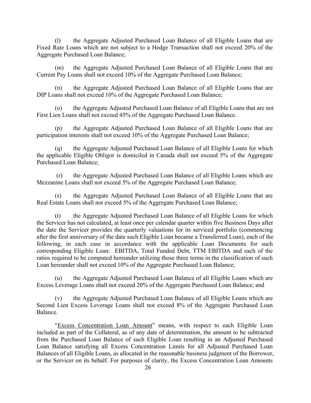 (l) the Aggregate Adjusted Purchased Loan Balance of all Eligible Loans that are Fixed Rate Loans which are not subject to a Hedge Transaction shall not exceed 20% of the Aggregate Purchased Loan Balance; (m) the Aggregate Adjusted Purchased Loan Balance of all Eligible Loans that are Current Pay Loans shall not exceed 10% of the Aggregate Purchased Loan Balance; (n) the Aggregate Adjusted Purchased Loan Balance of all Eligible Loans that are DIP Loans shall not exceed 10% of the Aggregate Purchased Loan Balance; (o) the Aggregate Adjusted Purchased Loan Balance of all Eligible Loans that are not First Lien Loans shall not exceed 45% of the Aggregate Purchased Loan Balance. (p) the Aggregate Adjusted Purchased Loan Balance of all Eligible Loans that are participation interests shall not exceed 10% of the Aggregate Purchased Loan Balance; (q) the Aggregate Adjusted Purchased Loan Balance of all Eligible Loans for which the applicable Eligible Obligor is domiciled in Canada shall not exceed 5% of the Aggregate Purchased Loan Balance; (r) the Aggregate Adjusted Purchased Loan Balance of all Eligible Loans which are Mezzanine Loans shall not exceed 5% of the Aggregate Purchased Loan Balance; (s) the Aggregate Adjusted Purchased Loan Balance of all Eligible Loans that are Real Estate Loans shall not exceed 5% of the Aggregate Purchased Loan Balance; (t) the Aggregate Adjusted Purchased Loan Balance of all Eligible Loans for which the Servicer has not calculated, at least once per calendar quarter within five Business Days after the date the Servicer provides the quarterly valuations for its serviced portfolio (commencing after the first anniversary of the date such Eligible Loan became a Transferred Loan), each of the following, in each case in accordance with the applicable Loan Documents for such corresponding Eligible Loan: EBITDA, Total Funded Debt, TTM EBITDA and each of the ratios required to be computed hereunder utilizing those three terms in the classification of such Loan hereunder shall not exceed 10% of the Aggregate Purchased Loan Balance; (u) the Aggregate Adjusted Purchased Loan Balance of all Eligible Loans which are Excess Leverage Loans shall not exceed 20% of the Aggregate Purchased Loan Balance; and (v) the Aggregate Adjusted Purchased Loan Balance of all Eligible Loans which are Second Lien Excess Leverage Loans shall not exceed 8% of the Aggregate Purchased Loan Balance. “Excess Concentration Loan Amount” means, with respect to each Eligible Loan included as part of the Collateral, as of any date of determination, the amount to be subtracted from the Purchased Loan Balance of such Eligible Loan resulting in an Adjusted Purchased Loan Balance satisfying all Excess Concentration Limits for all Adjusted Purchased Loan Balances of all Eligible Loans, as allocated in the reasonable business judgment of the Borrower, or the Servicer on its behalf. For purposes of clarity, the Excess Concentration Loan Amounts 26
