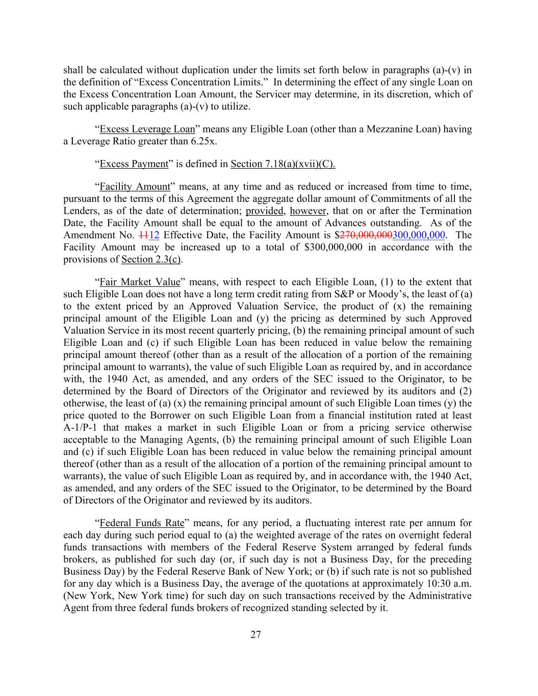 shall be calculated without duplication under the limits set forth below in paragraphs (a)-(v) in the definition of “Excess Concentration Limits.” In determining the effect of any single Loan on the Excess Concentration Loan Amount, the Servicer may determine, in its discretion, which of such applicable paragraphs (a)-(v) to utilize. “Excess Leverage Loan” means any Eligible Loan (other than a Mezzanine Loan) having a Leverage Ratio greater than 6.25x. “Excess Payment” is defined in Section 7.18(a)(xvii)(C). “Facility Amount” means, at any time and as reduced or increased from time to time, pursuant to the terms of this Agreement the aggregate dollar amount of Commitments of all the Lenders, as of the date of determination; provided, however, that on or after the Termination Date, the Facility Amount shall be equal to the amount of Advances outstanding. As of the Amendment No. 1112 Effective Date, the Facility Amount is $270,000,000300,000,000. The Facility Amount may be increased up to a total of $300,000,000 in accordance with the provisions of Section 2.3(c). “Fair Market Value” means, with respect to each Eligible Loan, (1) to the extent that such Eligible Loan does not have a long term credit rating from S&P or Moody’s, the least of (a) to the extent priced by an Approved Valuation Service, the product of (x) the remaining principal amount of the Eligible Loan and (y) the pricing as determined by such Approved Valuation Service in its most recent quarterly pricing, (b) the remaining principal amount of such Eligible Loan and (c) if such Eligible Loan has been reduced in value below the remaining principal amount thereof (other than as a result of the allocation of a portion of the remaining principal amount to warrants), the value of such Eligible Loan as required by, and in accordance with, the 1940 Act, as amended, and any orders of the SEC issued to the Originator, to be determined by the Board of Directors of the Originator and reviewed by its auditors and (2) otherwise, the least of (a) (x) the remaining principal amount of such Eligible Loan times (y) the price quoted to the Borrower on such Eligible Loan from a financial institution rated at least A-1/P-1 that makes a market in such Eligible Loan or from a pricing service otherwise acceptable to the Managing Agents, (b) the remaining principal amount of such Eligible Loan and (c) if such Eligible Loan has been reduced in value below the remaining principal amount thereof (other than as a result of the allocation of a portion of the remaining principal amount to warrants), the value of such Eligible Loan as required by, and in accordance with, the 1940 Act, as amended, and any orders of the SEC issued to the Originator, to be determined by the Board of Directors of the Originator and reviewed by its auditors. “Federal Funds Rate” means, for any period, a fluctuating interest rate per annum for each day during such period equal to (a) the weighted average of the rates on overnight federal funds transactions with members of the Federal Reserve System arranged by federal funds brokers, as published for such day (or, if such day is not a Business Day, for the preceding Business Day) by the Federal Reserve Bank of New York; or (b) if such rate is not so published for any day which is a Business Day, the average of the quotations at approximately 10:30 a.m. (New York, New York time) for such day on such transactions received by the Administrative Agent from three federal funds brokers of recognized standing selected by it. 27