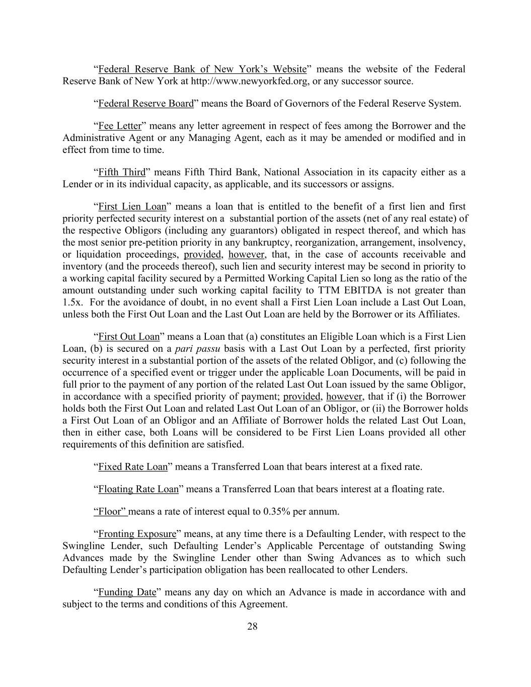 “Federal Reserve Bank of New York’s Website” means the website of the Federal Reserve Bank of New York at http://www.newyorkfed.org, or any successor source. “Federal Reserve Board” means the Board of Governors of the Federal Reserve System. “Fee Letter” means any letter agreement in respect of fees among the Borrower and the Administrative Agent or any Managing Agent, each as it may be amended or modified and in effect from time to time. “Fifth Third” means Fifth Third Bank, National Association in its capacity either as a Lender or in its individual capacity, as applicable, and its successors or assigns. “First Lien Loan” means a loan that is entitled to the benefit of a first lien and first priority perfected security interest on a substantial portion of the assets (net of any real estate) of the respective Obligors (including any guarantors) obligated in respect thereof, and which has the most senior pre-petition priority in any bankruptcy, reorganization, arrangement, insolvency, or liquidation proceedings, provided, however, that, in the case of accounts receivable and inventory (and the proceeds thereof), such lien and security interest may be second in priority to a working capital facility secured by a Permitted Working Capital Lien so long as the ratio of the amount outstanding under such working capital facility to TTM EBITDA is not greater than 1.5x. For the avoidance of doubt, in no event shall a First Lien Loan include a Last Out Loan, unless both the First Out Loan and the Last Out Loan are held by the Borrower or its Affiliates. “First Out Loan” means a Loan that (a) constitutes an Eligible Loan which is a First Lien Loan, (b) is secured on a pari passu basis with a Last Out Loan by a perfected, first priority security interest in a substantial portion of the assets of the related Obligor, and (c) following the occurrence of a specified event or trigger under the applicable Loan Documents, will be paid in full prior to the payment of any portion of the related Last Out Loan issued by the same Obligor, in accordance with a specified priority of payment; provided, however, that if (i) the Borrower holds both the First Out Loan and related Last Out Loan of an Obligor, or (ii) the Borrower holds a First Out Loan of an Obligor and an Affiliate of Borrower holds the related Last Out Loan, then in either case, both Loans will be considered to be First Lien Loans provided all other requirements of this definition are satisfied. “Fixed Rate Loan” means a Transferred Loan that bears interest at a fixed rate. “Floating Rate Loan” means a Transferred Loan that bears interest at a floating rate. “Floor” means a rate of interest equal to 0.35% per annum. “Fronting Exposure” means, at any time there is a Defaulting Lender, with respect to the Swingline Lender, such Defaulting Lender’s Applicable Percentage of outstanding Swing Advances made by the Swingline Lender other than Swing Advances as to which such Defaulting Lender’s participation obligation has been reallocated to other Lenders. “Funding Date” means any day on which an Advance is made in accordance with and subject to the terms and conditions of this Agreement. 28