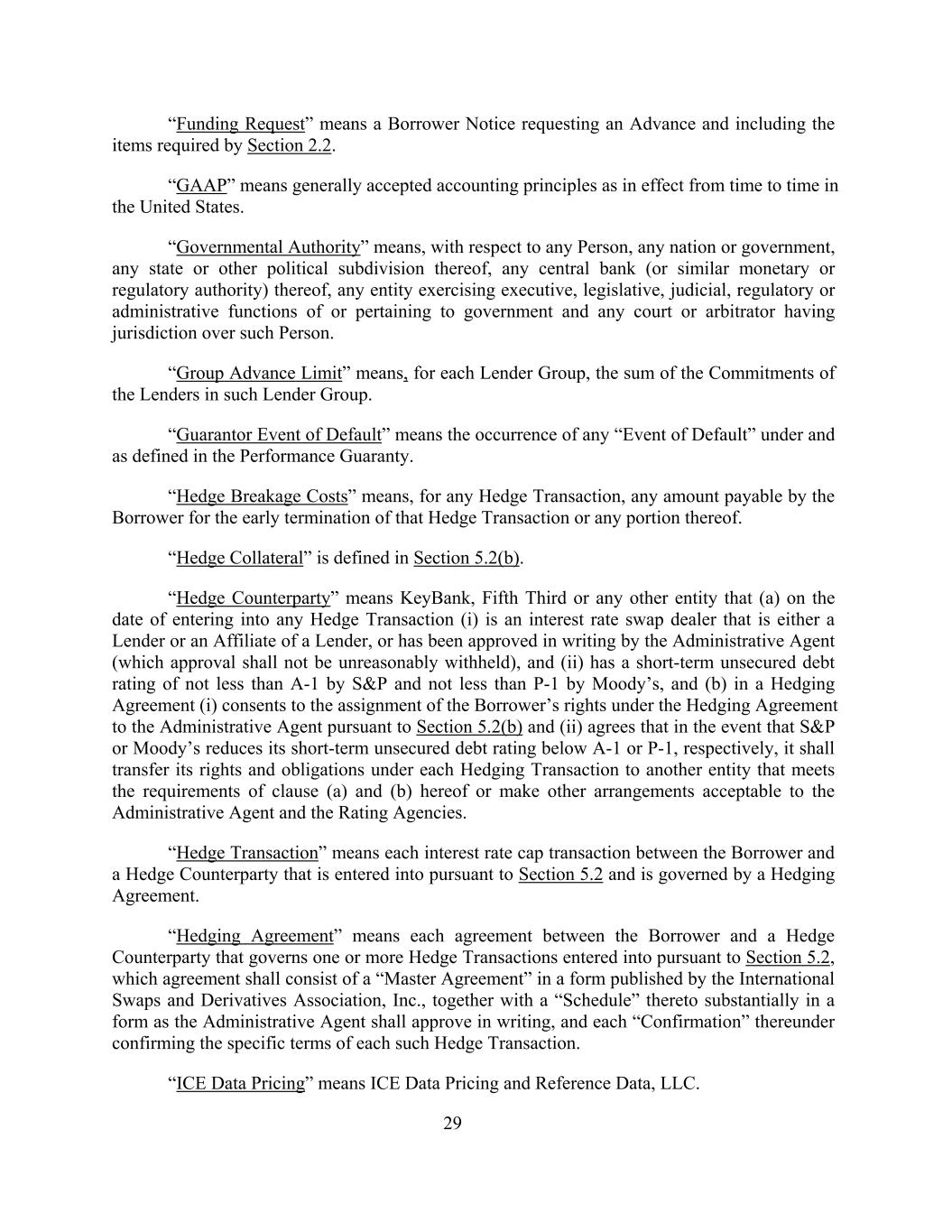 “Funding Request” means a Borrower Notice requesting an Advance and including the items required by Section 2.2. “GAAP” means generally accepted accounting principles as in effect from time to time in the United States. “Governmental Authority” means, with respect to any Person, any nation or government, any state or other political subdivision thereof, any central bank (or similar monetary or regulatory authority) thereof, any entity exercising executive, legislative, judicial, regulatory or administrative functions of or pertaining to government and any court or arbitrator having jurisdiction over such Person. “Group Advance Limit” means, for each Lender Group, the sum of the Commitments of the Lenders in such Lender Group. “Guarantor Event of Default” means the occurrence of any “Event of Default” under and as defined in the Performance Guaranty. “Hedge Breakage Costs” means, for any Hedge Transaction, any amount payable by the Borrower for the early termination of that Hedge Transaction or any portion thereof. “Hedge Collateral” is defined in Section 5.2(b). “Hedge Counterparty” means KeyBank, Fifth Third or any other entity that (a) on the date of entering into any Hedge Transaction (i) is an interest rate swap dealer that is either a Lender or an Affiliate of a Lender, or has been approved in writing by the Administrative Agent (which approval shall not be unreasonably withheld), and (ii) has a short-term unsecured debt rating of not less than A-1 by S&P and not less than P-1 by Moody’s, and (b) in a Hedging Agreement (i) consents to the assignment of the Borrower’s rights under the Hedging Agreement to the Administrative Agent pursuant to Section 5.2(b) and (ii) agrees that in the event that S&P or Moody’s reduces its short-term unsecured debt rating below A-1 or P-1, respectively, it shall transfer its rights and obligations under each Hedging Transaction to another entity that meets the requirements of clause (a) and (b) hereof or make other arrangements acceptable to the Administrative Agent and the Rating Agencies. “Hedge Transaction” means each interest rate cap transaction between the Borrower and a Hedge Counterparty that is entered into pursuant to Section 5.2 and is governed by a Hedging Agreement. “Hedging Agreement” means each agreement between the Borrower and a Hedge Counterparty that governs one or more Hedge Transactions entered into pursuant to Section 5.2, which agreement shall consist of a “Master Agreement” in a form published by the International Swaps and Derivatives Association, Inc., together with a “Schedule” thereto substantially in a form as the Administrative Agent shall approve in writing, and each “Confirmation” thereunder confirming the specific terms of each such Hedge Transaction. “ICE Data Pricing” means ICE Data Pricing and Reference Data, LLC. 29