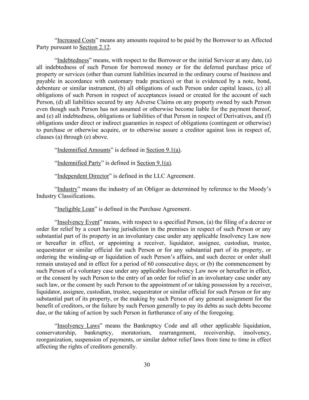 “Increased Costs” means any amounts required to be paid by the Borrower to an Affected Party pursuant to Section 2.12. “Indebtedness” means, with respect to the Borrower or the initial Servicer at any date, (a) all indebtedness of such Person for borrowed money or for the deferred purchase price of property or services (other than current liabilities incurred in the ordinary course of business and payable in accordance with customary trade practices) or that is evidenced by a note, bond, debenture or similar instrument, (b) all obligations of such Person under capital leases, (c) all obligations of such Person in respect of acceptances issued or created for the account of such Person, (d) all liabilities secured by any Adverse Claims on any property owned by such Person even though such Person has not assumed or otherwise become liable for the payment thereof, and (e) all indebtedness, obligations or liabilities of that Person in respect of Derivatives, and (f) obligations under direct or indirect guaranties in respect of obligations (contingent or otherwise) to purchase or otherwise acquire, or to otherwise assure a creditor against loss in respect of, clauses (a) through (e) above. “Indemnified Amounts” is defined in Section 9.1(a). “Indemnified Party” is defined in Section 9.1(a). “Independent Director” is defined in the LLC Agreement. “Industry” means the industry of an Obligor as determined by reference to the Moody’s Industry Classifications. “Ineligible Loan” is defined in the Purchase Agreement. “Insolvency Event” means, with respect to a specified Person, (a) the filing of a decree or order for relief by a court having jurisdiction in the premises in respect of such Person or any substantial part of its property in an involuntary case under any applicable Insolvency Law now or hereafter in effect, or appointing a receiver, liquidator, assignee, custodian, trustee, sequestrator or similar official for such Person or for any substantial part of its property, or ordering the winding-up or liquidation of such Person’s affairs, and such decree or order shall remain unstayed and in effect for a period of 60 consecutive days; or (b) the commencement by such Person of a voluntary case under any applicable Insolvency Law now or hereafter in effect, or the consent by such Person to the entry of an order for relief in an involuntary case under any such law, or the consent by such Person to the appointment of or taking possession by a receiver, liquidator, assignee, custodian, trustee, sequestrator or similar official for such Person or for any substantial part of its property, or the making by such Person of any general assignment for the benefit of creditors, or the failure by such Person generally to pay its debts as such debts become due, or the taking of action by such Person in furtherance of any of the foregoing. “Insolvency Laws” means the Bankruptcy Code and all other applicable liquidation, conservatorship, bankruptcy, moratorium, rearrangement, receivership, insolvency, reorganization, suspension of payments, or similar debtor relief laws from time to time in effect affecting the rights of creditors generally. 30