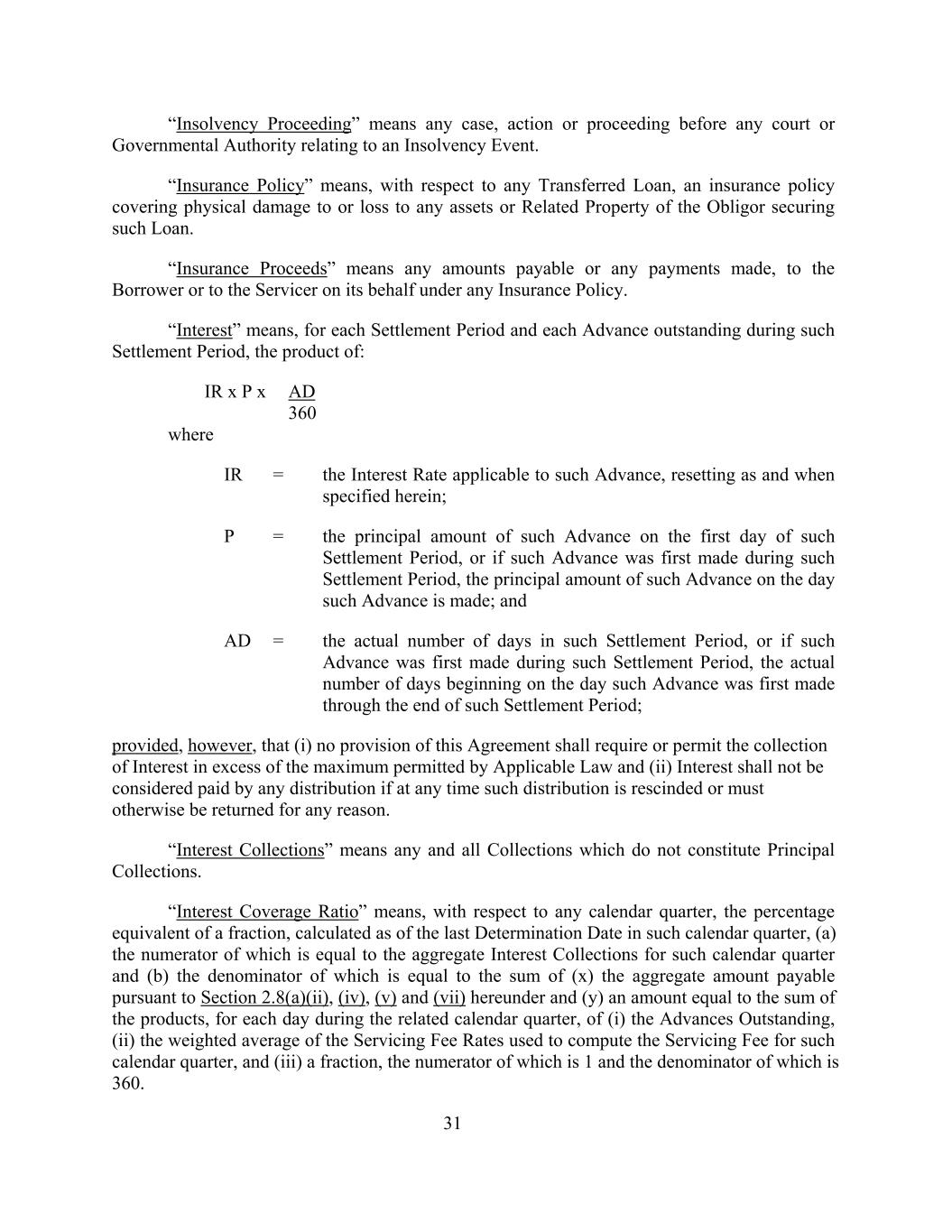 31 IR x P x “Insolvency Proceeding” means any case, action or proceeding before any court or Governmental Authority relating to an Insolvency Event. “Insurance Policy” means, with respect to any Transferred Loan, an insurance policy covering physical damage to or loss to any assets or Related Property of the Obligor securing such Loan. “Insurance Proceeds” means any amounts payable or any payments made, to the Borrower or to the Servicer on its behalf under any Insurance Policy. “Interest” means, for each Settlement Period and each Advance outstanding during such Settlement Period, the product of: AD 360 where IR = the Interest Rate applicable to such Advance, resetting as and when specified herein; P = the principal amount of such Advance on the first day of such Settlement Period, or if such Advance was first made during such Settlement Period, the principal amount of such Advance on the day such Advance is made; and AD = the actual number of days in such Settlement Period, or if such Advance was first made during such Settlement Period, the actual number of days beginning on the day such Advance was first made through the end of such Settlement Period; provided, however, that (i) no provision of this Agreement shall require or permit the collection of Interest in excess of the maximum permitted by Applicable Law and (ii) Interest shall not be considered paid by any distribution if at any time such distribution is rescinded or must otherwise be returned for any reason. “Interest Collections” means any and all Collections which do not constitute Principal Collections. “Interest Coverage Ratio” means, with respect to any calendar quarter, the percentage equivalent of a fraction, calculated as of the last Determination Date in such calendar quarter, (a) the numerator of which is equal to the aggregate Interest Collections for such calendar quarter and (b) the denominator of which is equal to the sum of (x) the aggregate amount payable pursuant to Section 2.8(a)(ii), (iv), (v) and (vii) hereunder and (y) an amount equal to the sum of the products, for each day during the related calendar quarter, of (i) the Advances Outstanding, (ii) the weighted average of the Servicing Fee Rates used to compute the Servicing Fee for such calendar quarter, and (iii) a fraction, the numerator of which is 1 and the denominator of which is 360.