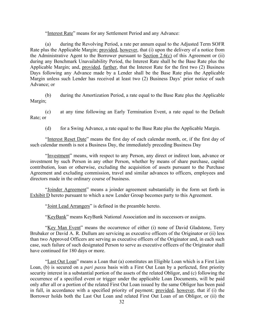 “Interest Rate” means for any Settlement Period and any Advance: (a) during the Revolving Period, a rate per annum equal to the Adjusted Term SOFR Rate plus the Applicable Margin; provided, however, that (i) upon the delivery of a notice from the Administrative Agent to the Borrower pursuant to Section 2.6(c) of this Agreement or (ii) during any Benchmark Unavailability Period, the Interest Rate shall be the Base Rate plus the Applicable Margin; and, provided, further, that the Interest Rate for the first two (2) Business Days following any Advance made by a Lender shall be the Base Rate plus the Applicable Margin unless such Lender has received at least two (2) Business Days’ prior notice of such Advance; or (b) during the Amortization Period, a rate equal to the Base Rate plus the Applicable Margin; (c) at any time following an Early Termination Event, a rate equal to the Default Rate; or (d) for a Swing Advance, a rate equal to the Base Rate plus the Applicable Margin. “Interest Reset Date” means the first day of each calendar month, or, if the first day of such calendar month is not a Business Day, the immediately preceding Business Day “Investment” means, with respect to any Person, any direct or indirect loan, advance or investment by such Person in any other Person, whether by means of share purchase, capital contribution, loan or otherwise, excluding the acquisition of assets pursuant to the Purchase Agreement and excluding commission, travel and similar advances to officers, employees and directors made in the ordinary course of business. “Joinder Agreement” means a joinder agreement substantially in the form set forth in Exhibit D hereto pursuant to which a new Lender Group becomes party to this Agreement. “Joint Lead Arrangers” is defined in the preamble hereto. “KeyBank” means KeyBank National Association and its successors or assigns. “Key Man Event” means the occurrence of either (i) none of David Gladstone, Terry Brubaker or David A. R. Dullum are servicing as executive officers of the Originator or (ii) less than two Approved Officers are serving as executive officers of the Originator and, in each such case, such failure of such designated Person to serve as executive officers of the Originator shall have continued for 180 days or more. “Last Out Loan” means a Loan that (a) constitutes an Eligible Loan which is a First Lien Loan, (b) is secured on a pari passu basis with a First Out Loan by a perfected, first priority security interest in a substantial portion of the assets of the related Obligor, and (c) following the occurrence of a specified event or trigger under the applicable Loan Documents, will be paid only after all or a portion of the related First Out Loan issued by the same Obligor has been paid in full, in accordance with a specified priority of payment; provided, however, that if (i) the Borrower holds both the Last Out Loan and related First Out Loan of an Obligor, or (ii) the 32