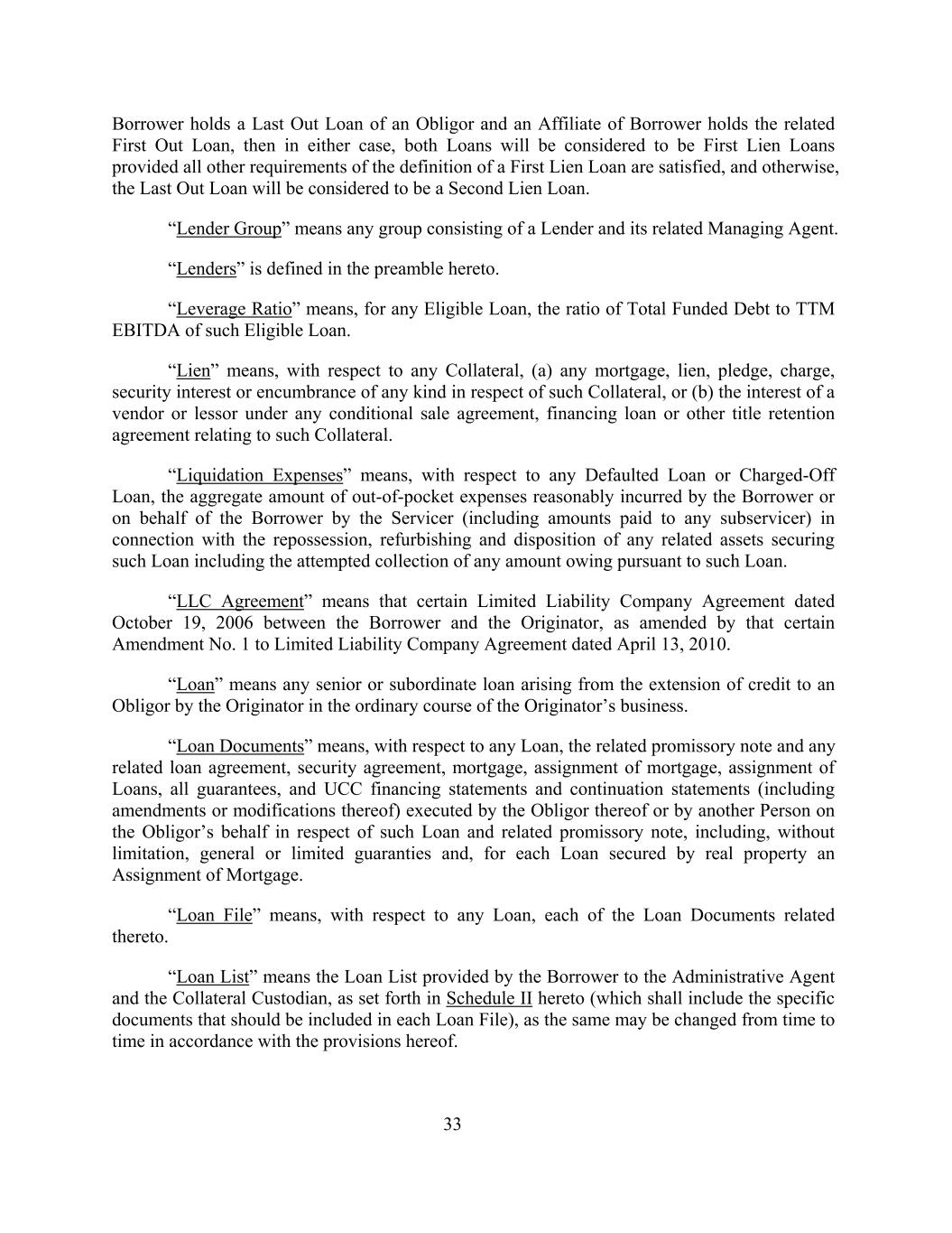 Borrower holds a Last Out Loan of an Obligor and an Affiliate of Borrower holds the related First Out Loan, then in either case, both Loans will be considered to be First Lien Loans provided all other requirements of the definition of a First Lien Loan are satisfied, and otherwise, the Last Out Loan will be considered to be a Second Lien Loan. “Lender Group” means any group consisting of a Lender and its related Managing Agent. “Lenders” is defined in the preamble hereto. “Leverage Ratio” means, for any Eligible Loan, the ratio of Total Funded Debt to TTM EBITDA of such Eligible Loan. “Lien” means, with respect to any Collateral, (a) any mortgage, lien, pledge, charge, security interest or encumbrance of any kind in respect of such Collateral, or (b) the interest of a vendor or lessor under any conditional sale agreement, financing loan or other title retention agreement relating to such Collateral. “Liquidation Expenses” means, with respect to any Defaulted Loan or Charged-Off Loan, the aggregate amount of out-of-pocket expenses reasonably incurred by the Borrower or on behalf of the Borrower by the Servicer (including amounts paid to any subservicer) in connection with the repossession, refurbishing and disposition of any related assets securing such Loan including the attempted collection of any amount owing pursuant to such Loan. “LLC Agreement” means that certain Limited Liability Company Agreement dated October 19, 2006 between the Borrower and the Originator, as amended by that certain Amendment No. 1 to Limited Liability Company Agreement dated April 13, 2010. “Loan” means any senior or subordinate loan arising from the extension of credit to an Obligor by the Originator in the ordinary course of the Originator’s business. “Loan Documents” means, with respect to any Loan, the related promissory note and any related loan agreement, security agreement, mortgage, assignment of mortgage, assignment of Loans, all guarantees, and UCC financing statements and continuation statements (including amendments or modifications thereof) executed by the Obligor thereof or by another Person on the Obligor’s behalf in respect of such Loan and related promissory note, including, without limitation, general or limited guaranties and, for each Loan secured by real property an Assignment of Mortgage. “Loan File” means, with respect to any Loan, each of the Loan Documents related thereto. “Loan List” means the Loan List provided by the Borrower to the Administrative Agent and the Collateral Custodian, as set forth in Schedule II hereto (which shall include the specific documents that should be included in each Loan File), as the same may be changed from time to time in accordance with the provisions hereof. 33