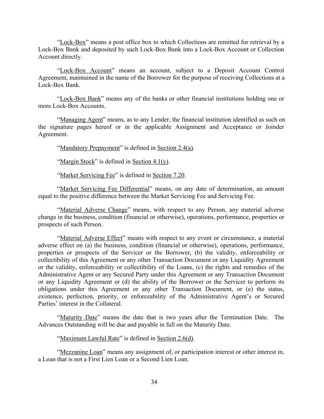 “Lock-Box” means a post office box to which Collections are remitted for retrieval by a Lock-Box Bank and deposited by such Lock-Box Bank into a Lock-Box Account or Collection Account directly. “Lock-Box Account” means an account, subject to a Deposit Account Control Agreement, maintained in the name of the Borrower for the purpose of receiving Collections at a Lock-Box Bank. “Lock-Box Bank” means any of the banks or other financial institutions holding one or more Lock-Box Accounts. “Managing Agent” means, as to any Lender, the financial institution identified as such on the signature pages hereof or in the applicable Assignment and Acceptance or Joinder Agreement. “Mandatory Prepayment” is defined in Section 2.4(a). “Margin Stock” is defined in Section 4.1(y). “Market Servicing Fee” is defined in Section 7.20. “Market Servicing Fee Differential” means, on any date of determination, an amount equal to the positive difference between the Market Servicing Fee and Servicing Fee. “Material Adverse Change” means, with respect to any Person, any material adverse change in the business, condition (financial or otherwise), operations, performance, properties or prospects of such Person. “Material Adverse Effect” means with respect to any event or circumstance, a material adverse effect on (a) the business, condition (financial or otherwise), operations, performance, properties or prospects of the Servicer or the Borrower, (b) the validity, enforceability or collectibility of this Agreement or any other Transaction Document or any Liquidity Agreement or the validity, enforceability or collectibility of the Loans, (c) the rights and remedies of the Administrative Agent or any Secured Party under this Agreement or any Transaction Document or any Liquidity Agreement or (d) the ability of the Borrower or the Servicer to perform its obligations under this Agreement or any other Transaction Document, or (e) the status, existence, perfection, priority, or enforceability of the Administrative Agent’s or Secured Parties’ interest in the Collateral. “Maturity Date” means the date that is two years after the Termination Date. The Advances Outstanding will be due and payable in full on the Maturity Date. “Maximum Lawful Rate” is defined in Section 2.6(d). “Mezzanine Loan” means any assignment of, or participation interest or other interest in, a Loan that is not a First Lien Loan or a Second Lien Loan. 34