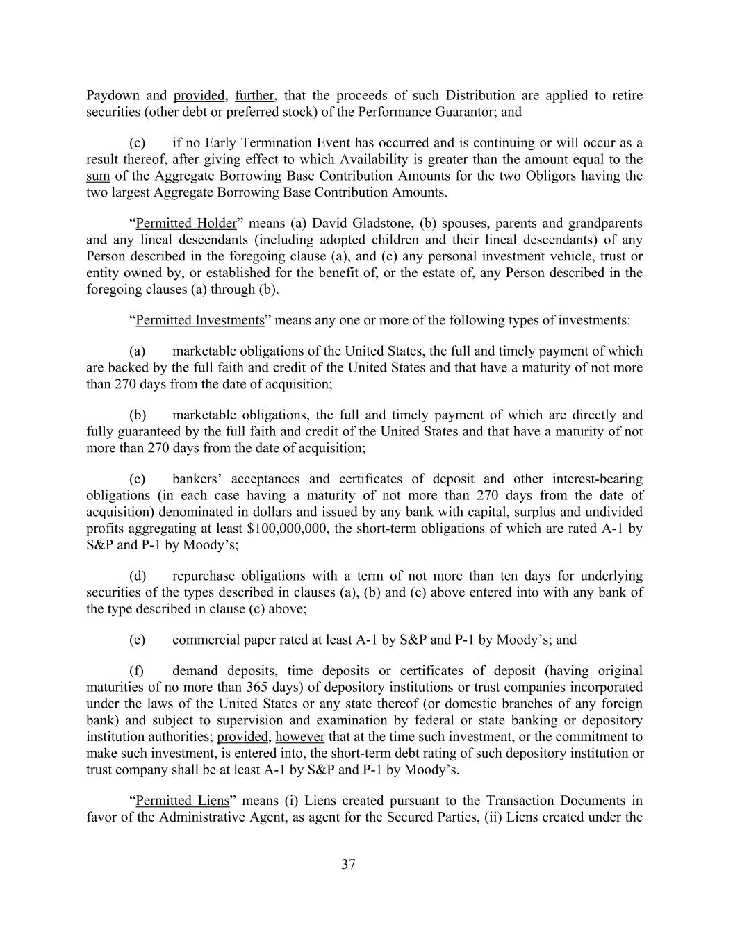 Paydown and provided, further, that the proceeds of such Distribution are applied to retire securities (other debt or preferred stock) of the Performance Guarantor; and (c) if no Early Termination Event has occurred and is continuing or will occur as a result thereof, after giving effect to which Availability is greater than the amount equal to the sum of the Aggregate Borrowing Base Contribution Amounts for the two Obligors having the two largest Aggregate Borrowing Base Contribution Amounts. “Permitted Holder” means (a) David Gladstone, (b) spouses, parents and grandparents and any lineal descendants (including adopted children and their lineal descendants) of any Person described in the foregoing clause (a), and (c) any personal investment vehicle, trust or entity owned by, or established for the benefit of, or the estate of, any Person described in the foregoing clauses (a) through (b). “Permitted Investments” means any one or more of the following types of investments: (a) marketable obligations of the United States, the full and timely payment of which are backed by the full faith and credit of the United States and that have a maturity of not more than 270 days from the date of acquisition; (b) marketable obligations, the full and timely payment of which are directly and fully guaranteed by the full faith and credit of the United States and that have a maturity of not more than 270 days from the date of acquisition; (c) bankers’ acceptances and certificates of deposit and other interest-bearing obligations (in each case having a maturity of not more than 270 days from the date of acquisition) denominated in dollars and issued by any bank with capital, surplus and undivided profits aggregating at least $100,000,000, the short-term obligations of which are rated A-1 by S&P and P-1 by Moody’s; (d) repurchase obligations with a term of not more than ten days for underlying securities of the types described in clauses (a), (b) and (c) above entered into with any bank of the type described in clause (c) above; (e) commercial paper rated at least A-1 by S&P and P-1 by Moody’s; and (f) demand deposits, time deposits or certificates of deposit (having original maturities of no more than 365 days) of depository institutions or trust companies incorporated under the laws of the United States or any state thereof (or domestic branches of any foreign bank) and subject to supervision and examination by federal or state banking or depository institution authorities; provided, however that at the time such investment, or the commitment to make such investment, is entered into, the short-term debt rating of such depository institution or trust company shall be at least A-1 by S&P and P-1 by Moody’s. “Permitted Liens” means (i) Liens created pursuant to the Transaction Documents in favor of the Administrative Agent, as agent for the Secured Parties, (ii) Liens created under the 37