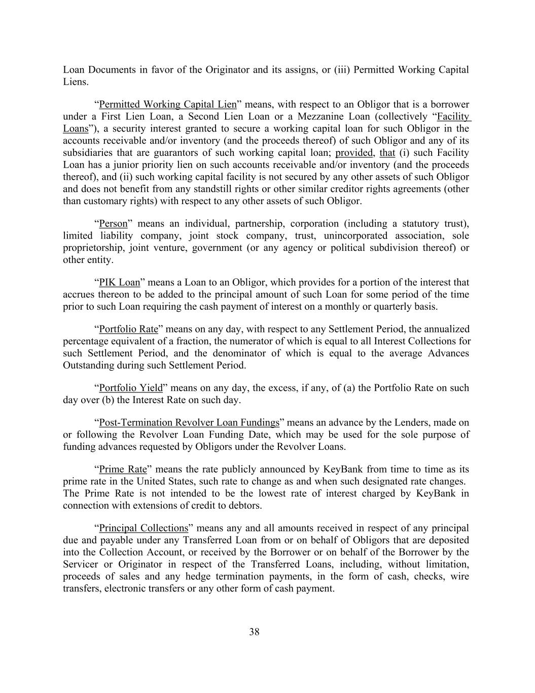 Loan Documents in favor of the Originator and its assigns, or (iii) Permitted Working Capital Liens. “Permitted Working Capital Lien” means, with respect to an Obligor that is a borrower under a First Lien Loan, a Second Lien Loan or a Mezzanine Loan (collectively “Facility Loans”), a security interest granted to secure a working capital loan for such Obligor in the accounts receivable and/or inventory (and the proceeds thereof) of such Obligor and any of its subsidiaries that are guarantors of such working capital loan; provided, that (i) such Facility Loan has a junior priority lien on such accounts receivable and/or inventory (and the proceeds thereof), and (ii) such working capital facility is not secured by any other assets of such Obligor and does not benefit from any standstill rights or other similar creditor rights agreements (other than customary rights) with respect to any other assets of such Obligor. “Person” means an individual, partnership, corporation (including a statutory trust), limited liability company, joint stock company, trust, unincorporated association, sole proprietorship, joint venture, government (or any agency or political subdivision thereof) or other entity. “PIK Loan” means a Loan to an Obligor, which provides for a portion of the interest that accrues thereon to be added to the principal amount of such Loan for some period of the time prior to such Loan requiring the cash payment of interest on a monthly or quarterly basis. “Portfolio Rate” means on any day, with respect to any Settlement Period, the annualized percentage equivalent of a fraction, the numerator of which is equal to all Interest Collections for such Settlement Period, and the denominator of which is equal to the average Advances Outstanding during such Settlement Period. “Portfolio Yield” means on any day, the excess, if any, of (a) the Portfolio Rate on such day over (b) the Interest Rate on such day. “Post-Termination Revolver Loan Fundings” means an advance by the Lenders, made on or following the Revolver Loan Funding Date, which may be used for the sole purpose of funding advances requested by Obligors under the Revolver Loans. “Prime Rate” means the rate publicly announced by KeyBank from time to time as its prime rate in the United States, such rate to change as and when such designated rate changes. The Prime Rate is not intended to be the lowest rate of interest charged by KeyBank in connection with extensions of credit to debtors. “Principal Collections” means any and all amounts received in respect of any principal due and payable under any Transferred Loan from or on behalf of Obligors that are deposited into the Collection Account, or received by the Borrower or on behalf of the Borrower by the Servicer or Originator in respect of the Transferred Loans, including, without limitation, proceeds of sales and any hedge termination payments, in the form of cash, checks, wire transfers, electronic transfers or any other form of cash payment. 38