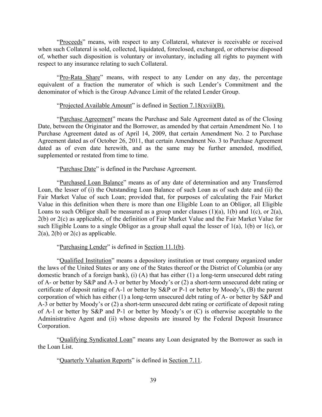 “Proceeds” means, with respect to any Collateral, whatever is receivable or received when such Collateral is sold, collected, liquidated, foreclosed, exchanged, or otherwise disposed of, whether such disposition is voluntary or involuntary, including all rights to payment with respect to any insurance relating to such Collateral. “Pro-Rata Share” means, with respect to any Lender on any day, the percentage equivalent of a fraction the numerator of which is such Lender’s Commitment and the denominator of which is the Group Advance Limit of the related Lender Group. “Projected Available Amount” is defined in Section 7.18(xvii)(B). “Purchase Agreement” means the Purchase and Sale Agreement dated as of the Closing Date, between the Originator and the Borrower, as amended by that certain Amendment No. 1 to Purchase Agreement dated as of April 14, 2009, that certain Amendment No. 2 to Purchase Agreement dated as of October 26, 2011, that certain Amendment No. 3 to Purchase Agreement dated as of even date herewith, and as the same may be further amended, modified, supplemented or restated from time to time. “Purchase Date” is defined in the Purchase Agreement. “Purchased Loan Balance” means as of any date of determination and any Transferred Loan, the lesser of (i) the Outstanding Loan Balance of such Loan as of such date and (ii) the Fair Market Value of such Loan; provided that, for purposes of calculating the Fair Market Value in this definition when there is more than one Eligible Loan to an Obligor, all Eligible Loans to such Obligor shall be measured as a group under clauses (1)(a), 1(b) and 1(c), or 2(a), 2(b) or 2(c) as applicable, of the definition of Fair Market Value and the Fair Market Value for such Eligible Loans to a single Obligor as a group shall equal the lesser of 1(a), 1(b) or 1(c), or 2(a), 2(b) or 2(c) as applicable. “Purchasing Lender” is defined in Section 11.1(b). “Qualified Institution” means a depository institution or trust company organized under the laws of the United States or any one of the States thereof or the District of Columbia (or any domestic branch of a foreign bank), (i) (A) that has either (1) a long-term unsecured debt rating of A- or better by S&P and A-3 or better by Moody’s or (2) a short-term unsecured debt rating or certificate of deposit rating of A-1 or better by S&P or P-1 or better by Moody’s, (B) the parent corporation of which has either (1) a long-term unsecured debt rating of A- or better by S&P and A-3 or better by Moody’s or (2) a short-term unsecured debt rating or certificate of deposit rating of A-1 or better by S&P and P-1 or better by Moody’s or (C) is otherwise acceptable to the Administrative Agent and (ii) whose deposits are insured by the Federal Deposit Insurance Corporation. “Qualifying Syndicated Loan” means any Loan designated by the Borrower as such in the Loan List. “Quarterly Valuation Reports” is defined in Section 7.11. 39