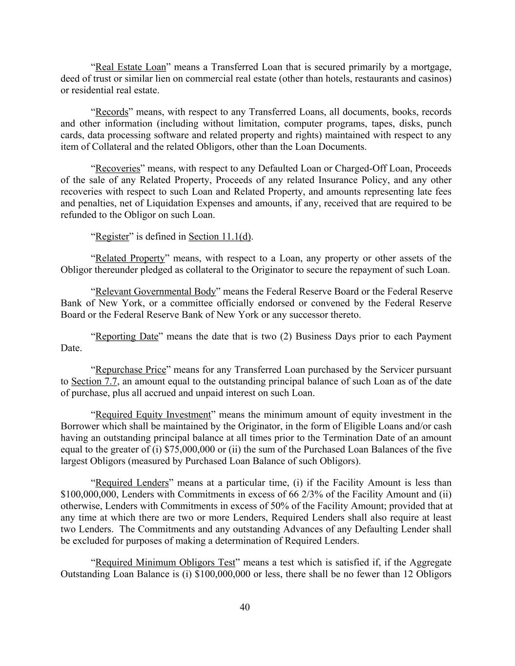“Real Estate Loan” means a Transferred Loan that is secured primarily by a mortgage, deed of trust or similar lien on commercial real estate (other than hotels, restaurants and casinos) or residential real estate. “Records” means, with respect to any Transferred Loans, all documents, books, records and other information (including without limitation, computer programs, tapes, disks, punch cards, data processing software and related property and rights) maintained with respect to any item of Collateral and the related Obligors, other than the Loan Documents. “Recoveries” means, with respect to any Defaulted Loan or Charged-Off Loan, Proceeds of the sale of any Related Property, Proceeds of any related Insurance Policy, and any other recoveries with respect to such Loan and Related Property, and amounts representing late fees and penalties, net of Liquidation Expenses and amounts, if any, received that are required to be refunded to the Obligor on such Loan. “Register” is defined in Section 11.1(d). “Related Property” means, with respect to a Loan, any property or other assets of the Obligor thereunder pledged as collateral to the Originator to secure the repayment of such Loan. “Relevant Governmental Body” means the Federal Reserve Board or the Federal Reserve Bank of New York, or a committee officially endorsed or convened by the Federal Reserve Board or the Federal Reserve Bank of New York or any successor thereto. “Reporting Date” means the date that is two (2) Business Days prior to each Payment Date. “Repurchase Price” means for any Transferred Loan purchased by the Servicer pursuant to Section 7.7, an amount equal to the outstanding principal balance of such Loan as of the date of purchase, plus all accrued and unpaid interest on such Loan. “Required Equity Investment” means the minimum amount of equity investment in the Borrower which shall be maintained by the Originator, in the form of Eligible Loans and/or cash having an outstanding principal balance at all times prior to the Termination Date of an amount equal to the greater of (i) $75,000,000 or (ii) the sum of the Purchased Loan Balances of the five largest Obligors (measured by Purchased Loan Balance of such Obligors). “Required Lenders” means at a particular time, (i) if the Facility Amount is less than $100,000,000, Lenders with Commitments in excess of 66 2/3% of the Facility Amount and (ii) otherwise, Lenders with Commitments in excess of 50% of the Facility Amount; provided that at any time at which there are two or more Lenders, Required Lenders shall also require at least two Lenders. The Commitments and any outstanding Advances of any Defaulting Lender shall be excluded for purposes of making a determination of Required Lenders. “Required Minimum Obligors Test” means a test which is satisfied if, if the Aggregate Outstanding Loan Balance is (i) $100,000,000 or less, there shall be no fewer than 12 Obligors 40