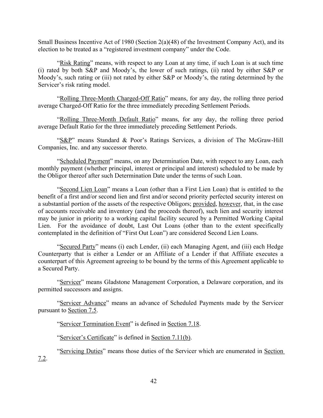 Small Business Incentive Act of 1980 (Section 2(a)(48) of the Investment Company Act), and its election to be treated as a “registered investment company” under the Code. “Risk Rating” means, with respect to any Loan at any time, if such Loan is at such time (i) rated by both S&P and Moody’s, the lower of such ratings, (ii) rated by either S&P or Moody’s, such rating or (iii) not rated by either S&P or Moody’s, the rating determined by the Servicer’s risk rating model. “Rolling Three-Month Charged-Off Ratio” means, for any day, the rolling three period average Charged-Off Ratio for the three immediately preceding Settlement Periods. “Rolling Three-Month Default Ratio” means, for any day, the rolling three period average Default Ratio for the three immediately preceding Settlement Periods. “S&P” means Standard & Poor’s Ratings Services, a division of The McGraw-Hill Companies, Inc. and any successor thereto. “Scheduled Payment” means, on any Determination Date, with respect to any Loan, each monthly payment (whether principal, interest or principal and interest) scheduled to be made by the Obligor thereof after such Determination Date under the terms of such Loan. “Second Lien Loan” means a Loan (other than a First Lien Loan) that is entitled to the benefit of a first and/or second lien and first and/or second priority perfected security interest on a substantial portion of the assets of the respective Obligors; provided, however, that, in the case of accounts receivable and inventory (and the proceeds thereof), such lien and security interest may be junior in priority to a working capital facility secured by a Permitted Working Capital Lien. For the avoidance of doubt, Last Out Loans (other than to the extent specifically contemplated in the definition of “First Out Loan”) are considered Second Lien Loans. “Secured Party” means (i) each Lender, (ii) each Managing Agent, and (iii) each Hedge Counterparty that is either a Lender or an Affiliate of a Lender if that Affiliate executes a counterpart of this Agreement agreeing to be bound by the terms of this Agreement applicable to a Secured Party. “Servicer” means Gladstone Management Corporation, a Delaware corporation, and its permitted successors and assigns. “Servicer Advance” means an advance of Scheduled Payments made by the Servicer pursuant to Section 7.5. “Servicer Termination Event” is defined in Section 7.18. “Servicer’s Certificate” is defined in Section 7.11(b). “Servicing Duties” means those duties of the Servicer which are enumerated in Section 7.2. 42