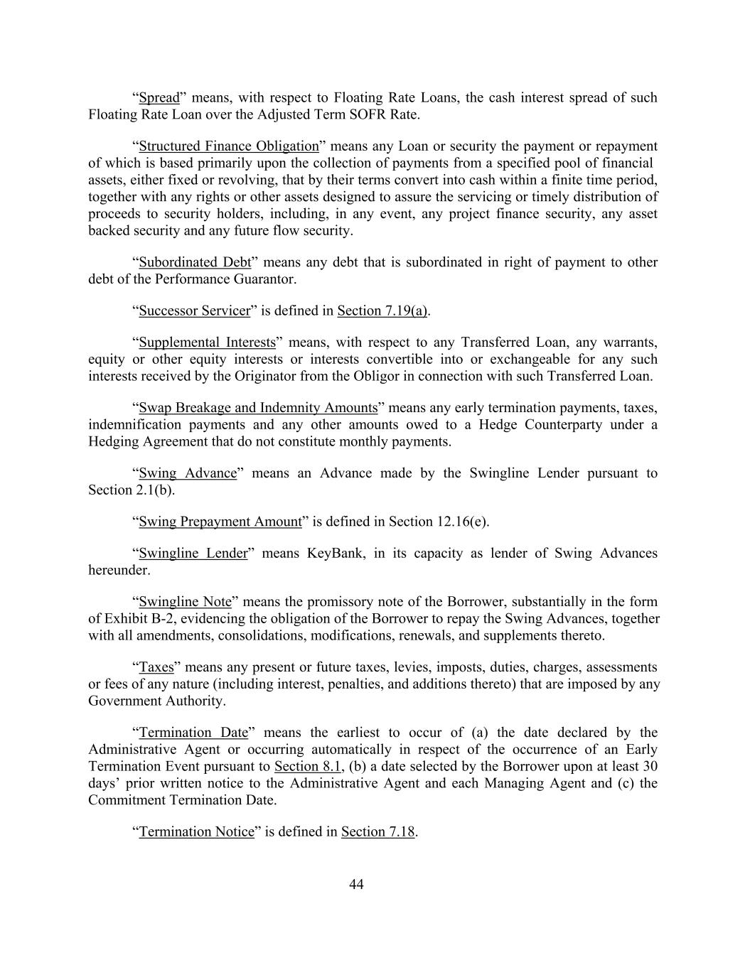 “Spread” means, with respect to Floating Rate Loans, the cash interest spread of such Floating Rate Loan over the Adjusted Term SOFR Rate. “Structured Finance Obligation” means any Loan or security the payment or repayment of which is based primarily upon the collection of payments from a specified pool of financial assets, either fixed or revolving, that by their terms convert into cash within a finite time period, together with any rights or other assets designed to assure the servicing or timely distribution of proceeds to security holders, including, in any event, any project finance security, any asset backed security and any future flow security. “Subordinated Debt” means any debt that is subordinated in right of payment to other debt of the Performance Guarantor. “Successor Servicer” is defined in Section 7.19(a). “Supplemental Interests” means, with respect to any Transferred Loan, any warrants, equity or other equity interests or interests convertible into or exchangeable for any such interests received by the Originator from the Obligor in connection with such Transferred Loan. “Swap Breakage and Indemnity Amounts” means any early termination payments, taxes, indemnification payments and any other amounts owed to a Hedge Counterparty under a Hedging Agreement that do not constitute monthly payments. “Swing Advance” means an Advance made by the Swingline Lender pursuant to Section 2.1(b). “Swing Prepayment Amount” is defined in Section 12.16(e). “Swingline Lender” means KeyBank, in its capacity as lender of Swing Advances hereunder. “Swingline Note” means the promissory note of the Borrower, substantially in the form of Exhibit B-2, evidencing the obligation of the Borrower to repay the Swing Advances, together with all amendments, consolidations, modifications, renewals, and supplements thereto. “Taxes” means any present or future taxes, levies, imposts, duties, charges, assessments or fees of any nature (including interest, penalties, and additions thereto) that are imposed by any Government Authority. “Termination Date” means the earliest to occur of (a) the date declared by the Administrative Agent or occurring automatically in respect of the occurrence of an Early Termination Event pursuant to Section 8.1, (b) a date selected by the Borrower upon at least 30 days’ prior written notice to the Administrative Agent and each Managing Agent and (c) the Commitment Termination Date. “Termination Notice” is defined in Section 7.18. 44