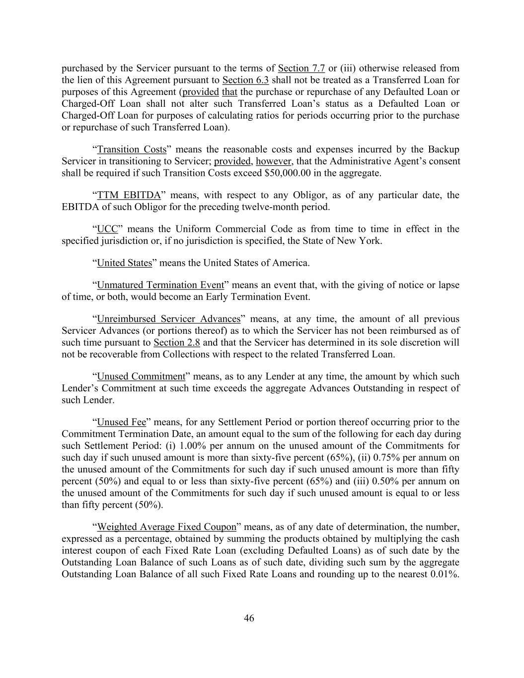 purchased by the Servicer pursuant to the terms of Section 7.7 or (iii) otherwise released from the lien of this Agreement pursuant to Section 6.3 shall not be treated as a Transferred Loan for purposes of this Agreement (provided that the purchase or repurchase of any Defaulted Loan or Charged-Off Loan shall not alter such Transferred Loan’s status as a Defaulted Loan or Charged-Off Loan for purposes of calculating ratios for periods occurring prior to the purchase or repurchase of such Transferred Loan). “Transition Costs” means the reasonable costs and expenses incurred by the Backup Servicer in transitioning to Servicer; provided, however, that the Administrative Agent’s consent shall be required if such Transition Costs exceed $50,000.00 in the aggregate. “TTM EBITDA” means, with respect to any Obligor, as of any particular date, the EBITDA of such Obligor for the preceding twelve-month period. “UCC” means the Uniform Commercial Code as from time to time in effect in the specified jurisdiction or, if no jurisdiction is specified, the State of New York. “United States” means the United States of America. “Unmatured Termination Event” means an event that, with the giving of notice or lapse of time, or both, would become an Early Termination Event. “Unreimbursed Servicer Advances” means, at any time, the amount of all previous Servicer Advances (or portions thereof) as to which the Servicer has not been reimbursed as of such time pursuant to Section 2.8 and that the Servicer has determined in its sole discretion will not be recoverable from Collections with respect to the related Transferred Loan. “Unused Commitment” means, as to any Lender at any time, the amount by which such Lender’s Commitment at such time exceeds the aggregate Advances Outstanding in respect of such Lender. “Unused Fee” means, for any Settlement Period or portion thereof occurring prior to the Commitment Termination Date, an amount equal to the sum of the following for each day during such Settlement Period: (i) 1.00% per annum on the unused amount of the Commitments for such day if such unused amount is more than sixty-five percent (65%), (ii) 0.75% per annum on the unused amount of the Commitments for such day if such unused amount is more than fifty percent (50%) and equal to or less than sixty-five percent (65%) and (iii) 0.50% per annum on the unused amount of the Commitments for such day if such unused amount is equal to or less than fifty percent (50%). “Weighted Average Fixed Coupon” means, as of any date of determination, the number, expressed as a percentage, obtained by summing the products obtained by multiplying the cash interest coupon of each Fixed Rate Loan (excluding Defaulted Loans) as of such date by the Outstanding Loan Balance of such Loans as of such date, dividing such sum by the aggregate Outstanding Loan Balance of all such Fixed Rate Loans and rounding up to the nearest 0.01%. 46