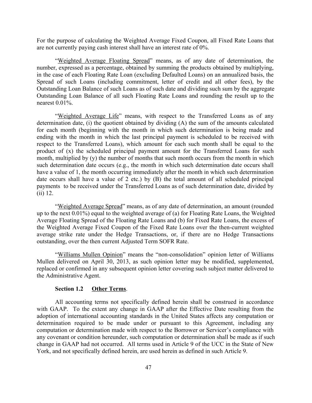 For the purpose of calculating the Weighted Average Fixed Coupon, all Fixed Rate Loans that are not currently paying cash interest shall have an interest rate of 0%. “Weighted Average Floating Spread” means, as of any date of determination, the number, expressed as a percentage, obtained by summing the products obtained by multiplying, in the case of each Floating Rate Loan (excluding Defaulted Loans) on an annualized basis, the Spread of such Loans (including commitment, letter of credit and all other fees), by the Outstanding Loan Balance of such Loans as of such date and dividing such sum by the aggregate Outstanding Loan Balance of all such Floating Rate Loans and rounding the result up to the nearest 0.01%. “Weighted Average Life” means, with respect to the Transferred Loans as of any determination date, (i) the quotient obtained by dividing (A) the sum of the amounts calculated for each month (beginning with the month in which such determination is being made and ending with the month in which the last principal payment is scheduled to be received with respect to the Transferred Loans), which amount for each such month shall be equal to the product of (x) the scheduled principal payment amount for the Transferred Loans for such month, multiplied by (y) the number of months that such month occurs from the month in which such determination date occurs (e.g., the month in which such determination date occurs shall have a value of 1, the month occurring immediately after the month in which such determination date occurs shall have a value of 2 etc.) by (B) the total amount of all scheduled principal payments to be received under the Transferred Loans as of such determination date, divided by (ii) 12. “Weighted Average Spread” means, as of any date of determination, an amount (rounded up to the next 0.01%) equal to the weighted average of (a) for Floating Rate Loans, the Weighted Average Floating Spread of the Floating Rate Loans and (b) for Fixed Rate Loans, the excess of the Weighted Average Fixed Coupon of the Fixed Rate Loans over the then-current weighted average strike rate under the Hedge Transactions, or, if there are no Hedge Transactions outstanding, over the then current Adjusted Term SOFR Rate. “Williams Mullen Opinion” means the “non-consolidation” opinion letter of Williams Mullen delivered on April 30, 2013, as such opinion letter may be modified, supplemented, replaced or confirmed in any subsequent opinion letter covering such subject matter delivered to the Administrative Agent. Section 1.2 Other Terms. All accounting terms not specifically defined herein shall be construed in accordance with GAAP. To the extent any change in GAAP after the Effective Date resulting from the adoption of international accounting standards in the United States affects any computation or determination required to be made under or pursuant to this Agreement, including any computation or determination made with respect to the Borrower or Servicer’s compliance with any covenant or condition hereunder, such computation or determination shall be made as if such change in GAAP had not occurred. All terms used in Article 9 of the UCC in the State of New York, and not specifically defined herein, are used herein as defined in such Article 9. 47