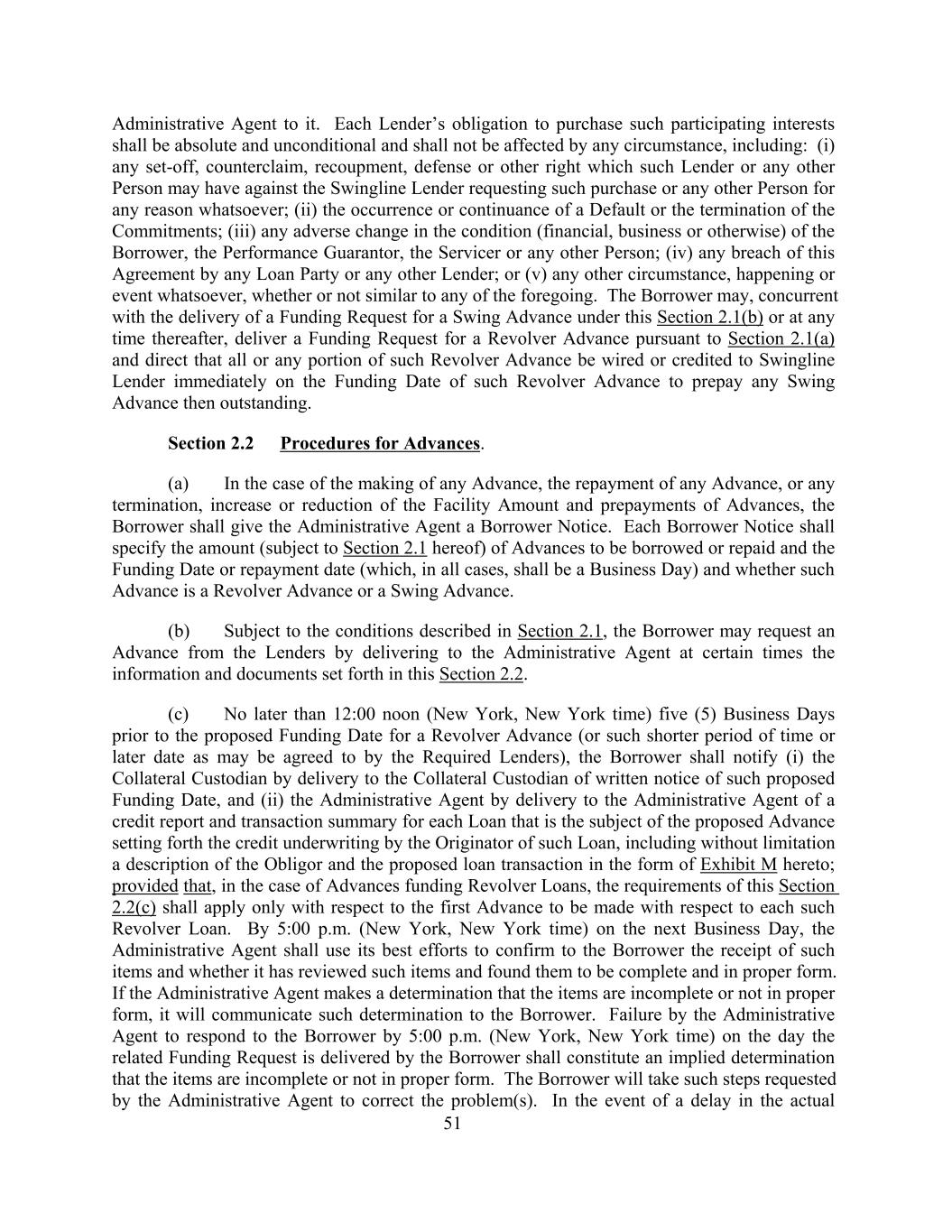 Administrative Agent to it. Each Lender’s obligation to purchase such participating interests shall be absolute and unconditional and shall not be affected by any circumstance, including: (i) any set-off, counterclaim, recoupment, defense or other right which such Lender or any other Person may have against the Swingline Lender requesting such purchase or any other Person for any reason whatsoever; (ii) the occurrence or continuance of a Default or the termination of the Commitments; (iii) any adverse change in the condition (financial, business or otherwise) of the Borrower, the Performance Guarantor, the Servicer or any other Person; (iv) any breach of this Agreement by any Loan Party or any other Lender; or (v) any other circumstance, happening or event whatsoever, whether or not similar to any of the foregoing. The Borrower may, concurrent with the delivery of a Funding Request for a Swing Advance under this Section 2.1(b) or at any time thereafter, deliver a Funding Request for a Revolver Advance pursuant to Section 2.1(a) and direct that all or any portion of such Revolver Advance be wired or credited to Swingline Lender immediately on the Funding Date of such Revolver Advance to prepay any Swing Advance then outstanding. Section 2.2 Procedures for Advances. (a) In the case of the making of any Advance, the repayment of any Advance, or any termination, increase or reduction of the Facility Amount and prepayments of Advances, the Borrower shall give the Administrative Agent a Borrower Notice. Each Borrower Notice shall specify the amount (subject to Section 2.1 hereof) of Advances to be borrowed or repaid and the Funding Date or repayment date (which, in all cases, shall be a Business Day) and whether such Advance is a Revolver Advance or a Swing Advance. (b) Subject to the conditions described in Section 2.1, the Borrower may request an Advance from the Lenders by delivering to the Administrative Agent at certain times the information and documents set forth in this Section 2.2. (c) No later than 12:00 noon (New York, New York time) five (5) Business Days prior to the proposed Funding Date for a Revolver Advance (or such shorter period of time or later date as may be agreed to by the Required Lenders), the Borrower shall notify (i) the Collateral Custodian by delivery to the Collateral Custodian of written notice of such proposed Funding Date, and (ii) the Administrative Agent by delivery to the Administrative Agent of a credit report and transaction summary for each Loan that is the subject of the proposed Advance setting forth the credit underwriting by the Originator of such Loan, including without limitation a description of the Obligor and the proposed loan transaction in the form of Exhibit M hereto; provided that, in the case of Advances funding Revolver Loans, the requirements of this Section 2.2(c) shall apply only with respect to the first Advance to be made with respect to each such Revolver Loan. By 5:00 p.m. (New York, New York time) on the next Business Day, the Administrative Agent shall use its best efforts to confirm to the Borrower the receipt of such items and whether it has reviewed such items and found them to be complete and in proper form. If the Administrative Agent makes a determination that the items are incomplete or not in proper form, it will communicate such determination to the Borrower. Failure by the Administrative Agent to respond to the Borrower by 5:00 p.m. (New York, New York time) on the day the related Funding Request is delivered by the Borrower shall constitute an implied determination that the items are incomplete or not in proper form. The Borrower will take such steps requested by the Administrative Agent to correct the problem(s). In the event of a delay in the actual 51