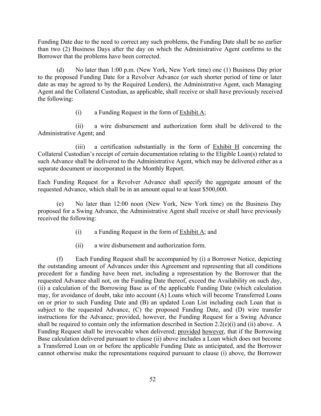 Funding Date due to the need to correct any such problems, the Funding Date shall be no earlier than two (2) Business Days after the day on which the Administrative Agent confirms to the Borrower that the problems have been corrected. (d) No later than 1:00 p.m. (New York, New York time) one (1) Business Day prior to the proposed Funding Date for a Revolver Advance (or such shorter period of time or later date as may be agreed to by the Required Lenders), the Administrative Agent, each Managing Agent and the Collateral Custodian, as applicable, shall receive or shall have previously received the following: (i) a Funding Request in the form of Exhibit A; (ii) a wire disbursement and authorization form shall be delivered to the Administrative Agent; and (iii) a certification substantially in the form of Exhibit H concerning the Collateral Custodian’s receipt of certain documentation relating to the Eligible Loan(s) related to such Advance shall be delivered to the Administrative Agent, which may be delivered either as a separate document or incorporated in the Monthly Report. Each Funding Request for a Revolver Advance shall specify the aggregate amount of the requested Advance, which shall be in an amount equal to at least $500,000. (e) No later than 12:00 noon (New York, New York time) on the Business Day proposed for a Swing Advance, the Administrative Agent shall receive or shall have previously received the following: (i) a Funding Request in the form of Exhibit A; and (ii) a wire disbursement and authorization form. (f) Each Funding Request shall be accompanied by (i) a Borrower Notice, depicting the outstanding amount of Advances under this Agreement and representing that all conditions precedent for a funding have been met, including a representation by the Borrower that the requested Advance shall not, on the Funding Date thereof, exceed the Availability on such day, (ii) a calculation of the Borrowing Base as of the applicable Funding Date (which calculation may, for avoidance of doubt, take into account (A) Loans which will become Transferred Loans on or prior to such Funding Date and (B) an updated Loan List including each Loan that is subject to the requested Advance, (C) the proposed Funding Date, and (D) wire transfer instructions for the Advance; provided, however, the Funding Request for a Swing Advance shall be required to contain only the information described in Section 2.2(e)(i) and (ii) above. A Funding Request shall be irrevocable when delivered; provided however, that if the Borrowing Base calculation delivered pursuant to clause (ii) above includes a Loan which does not become a Transferred Loan on or before the applicable Funding Date as anticipated, and the Borrower cannot otherwise make the representations required pursuant to clause (i) above, the Borrower 52