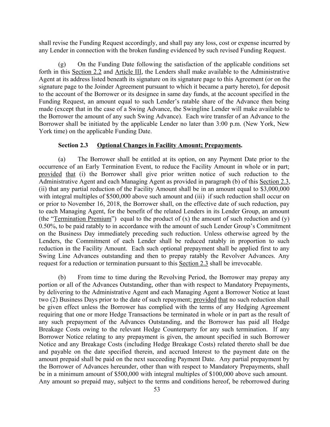shall revise the Funding Request accordingly, and shall pay any loss, cost or expense incurred by any Lender in connection with the broken funding evidenced by such revised Funding Request. (g) On the Funding Date following the satisfaction of the applicable conditions set forth in this Section 2.2 and Article III, the Lenders shall make available to the Administrative Agent at its address listed beneath its signature on its signature page to this Agreement (or on the signature page to the Joinder Agreement pursuant to which it became a party hereto), for deposit to the account of the Borrower or its designee in same day funds, at the account specified in the Funding Request, an amount equal to such Lender’s ratable share of the Advance then being made (except that in the case of a Swing Advance, the Swingline Lender will make available to the Borrower the amount of any such Swing Advance). Each wire transfer of an Advance to the Borrower shall be initiated by the applicable Lender no later than 3:00 p.m. (New York, New York time) on the applicable Funding Date. Section 2.3 Optional Changes in Facility Amount; Prepayments. (a) The Borrower shall be entitled at its option, on any Payment Date prior to the occurrence of an Early Termination Event, to reduce the Facility Amount in whole or in part; provided that (i) the Borrower shall give prior written notice of such reduction to the Administrative Agent and each Managing Agent as provided in paragraph (b) of this Section 2.3, (ii) that any partial reduction of the Facility Amount shall be in an amount equal to $3,000,000 with integral multiples of $500,000 above such amount and (iii) if such reduction shall occur on or prior to November 16, 2018, the Borrower shall, on the effective date of such reduction, pay to each Managing Agent, for the benefit of the related Lenders in its Lender Group, an amount (the “Termination Premium”) equal to the product of (x) the amount of such reduction and (y) 0.50%, to be paid ratably to in accordance with the amount of such Lender Group’s Commitment on the Business Day immediately preceding such reduction. Unless otherwise agreed by the Lenders, the Commitment of each Lender shall be reduced ratably in proportion to such reduction in the Facility Amount. Each such optional prepayment shall be applied first to any Swing Line Advances outstanding and then to prepay ratably the Revolver Advances. Any request for a reduction or termination pursuant to this Section 2.3 shall be irrevocable. (b) From time to time during the Revolving Period, the Borrower may prepay any portion or all of the Advances Outstanding, other than with respect to Mandatory Prepayments, by delivering to the Administrative Agent and each Managing Agent a Borrower Notice at least two (2) Business Days prior to the date of such repayment; provided that no such reduction shall be given effect unless the Borrower has complied with the terms of any Hedging Agreement requiring that one or more Hedge Transactions be terminated in whole or in part as the result of any such prepayment of the Advances Outstanding, and the Borrower has paid all Hedge Breakage Costs owing to the relevant Hedge Counterparty for any such termination. If any Borrower Notice relating to any prepayment is given, the amount specified in such Borrower Notice and any Breakage Costs (including Hedge Breakage Costs) related thereto shall be due and payable on the date specified therein, and accrued Interest to the payment date on the amount prepaid shall be paid on the next succeeding Payment Date. Any partial prepayment by the Borrower of Advances hereunder, other than with respect to Mandatory Prepayments, shall be in a minimum amount of $500,000 with integral multiples of $100,000 above such amount. Any amount so prepaid may, subject to the terms and conditions hereof, be reborrowed during 53
