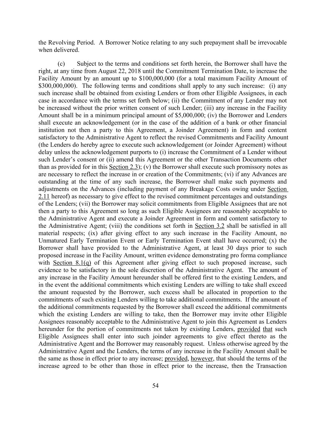 the Revolving Period. A Borrower Notice relating to any such prepayment shall be irrevocable when delivered. (c) Subject to the terms and conditions set forth herein, the Borrower shall have the right, at any time from August 22, 2018 until the Commitment Termination Date, to increase the Facility Amount by an amount up to $100,000,000 (for a total maximum Facility Amount of $300,000,000). The following terms and conditions shall apply to any such increase: (i) any such increase shall be obtained from existing Lenders or from other Eligible Assignees, in each case in accordance with the terms set forth below; (ii) the Commitment of any Lender may not be increased without the prior written consent of such Lender; (iii) any increase in the Facility Amount shall be in a minimum principal amount of $5,000,000; (iv) the Borrower and Lenders shall execute an acknowledgement (or in the case of the addition of a bank or other financial institution not then a party to this Agreement, a Joinder Agreement) in form and content satisfactory to the Administrative Agent to reflect the revised Commitments and Facility Amount (the Lenders do hereby agree to execute such acknowledgement (or Joinder Agreement) without delay unless the acknowledgement purports to (i) increase the Commitment of a Lender without such Lender’s consent or (ii) amend this Agreement or the other Transaction Documents other than as provided for in this Section 2.3); (v) the Borrower shall execute such promissory notes as are necessary to reflect the increase in or creation of the Commitments; (vi) if any Advances are outstanding at the time of any such increase, the Borrower shall make such payments and adjustments on the Advances (including payment of any Breakage Costs owing under Section 2.11 hereof) as necessary to give effect to the revised commitment percentages and outstandings of the Lenders; (vii) the Borrower may solicit commitments from Eligible Assignees that are not then a party to this Agreement so long as such Eligible Assignees are reasonably acceptable to the Administrative Agent and execute a Joinder Agreement in form and content satisfactory to the Administrative Agent; (viii) the conditions set forth in Section 3.2 shall be satisfied in all material respects; (ix) after giving effect to any such increase in the Facility Amount, no Unmatured Early Termination Event or Early Termination Event shall have occurred; (x) the Borrower shall have provided to the Administrative Agent, at least 30 days prior to such proposed increase in the Facility Amount, written evidence demonstrating pro forma compliance with Section 8.1(q) of this Agreement after giving effect to such proposed increase, such evidence to be satisfactory in the sole discretion of the Administrative Agent. The amount of any increase in the Facility Amount hereunder shall be offered first to the existing Lenders, and in the event the additional commitments which existing Lenders are willing to take shall exceed the amount requested by the Borrower, such excess shall be allocated in proportion to the commitments of such existing Lenders willing to take additional commitments. If the amount of the additional commitments requested by the Borrower shall exceed the additional commitments which the existing Lenders are willing to take, then the Borrower may invite other Eligible Assignees reasonably acceptable to the Administrative Agent to join this Agreement as Lenders hereunder for the portion of commitments not taken by existing Lenders, provided that such Eligible Assignees shall enter into such joinder agreements to give effect thereto as the Administrative Agent and the Borrower may reasonably request. Unless otherwise agreed by the Administrative Agent and the Lenders, the terms of any increase in the Facility Amount shall be the same as those in effect prior to any increase; provided, however, that should the terms of the increase agreed to be other than those in effect prior to the increase, then the Transaction 54
