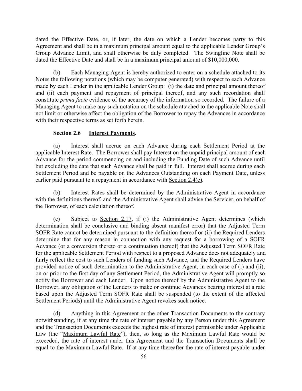 dated the Effective Date, or, if later, the date on which a Lender becomes party to this Agreement and shall be in a maximum principal amount equal to the applicable Lender Group’s Group Advance Limit, and shall otherwise be duly completed. The Swingline Note shall be dated the Effective Date and shall be in a maximum principal amount of $10,000,000. (b) Each Managing Agent is hereby authorized to enter on a schedule attached to its Notes the following notations (which may be computer generated) with respect to each Advance made by each Lender in the applicable Lender Group: (i) the date and principal amount thereof and (ii) each payment and repayment of principal thereof, and any such recordation shall constitute prima facie evidence of the accuracy of the information so recorded. The failure of a Managing Agent to make any such notation on the schedule attached to the applicable Note shall not limit or otherwise affect the obligation of the Borrower to repay the Advances in accordance with their respective terms as set forth herein. Section 2.6 Interest Payments. (a) Interest shall accrue on each Advance during each Settlement Period at the applicable Interest Rate. The Borrower shall pay Interest on the unpaid principal amount of each Advance for the period commencing on and including the Funding Date of such Advance until but excluding the date that such Advance shall be paid in full. Interest shall accrue during each Settlement Period and be payable on the Advances Outstanding on each Payment Date, unless earlier paid pursuant to a repayment in accordance with Section 2.4(c). (b) Interest Rates shall be determined by the Administrative Agent in accordance with the definitions thereof, and the Administrative Agent shall advise the Servicer, on behalf of the Borrower, of each calculation thereof. (c) Subject to Section 2.17, if (i) the Administrative Agent determines (which determination shall be conclusive and binding absent manifest error) that the Adjusted Term SOFR Rate cannot be determined pursuant to the definition thereof or (ii) the Required Lenders determine that for any reason in connection with any request for a borrowing of a SOFR Advance (or a conversion thereto or a continuation thereof) that the Adjusted Term SOFR Rate for the applicable Settlement Period with respect to a proposed Advance does not adequately and fairly reflect the cost to such Lenders of funding such Advance, and the Required Lenders have provided notice of such determination to the Administrative Agent, in each case of (i) and (ii), on or prior to the first day of any Settlement Period, the Administrative Agent will promptly so notify the Borrower and each Lender. Upon notice thereof by the Administrative Agent to the Borrower, any obligation of the Lenders to make or continue Advances bearing interest at a rate based upon the Adjusted Term SOFR Rate shall be suspended (to the extent of the affected Settlement Periods) until the Administrative Agent revokes such notice. (d) Anything in this Agreement or the other Transaction Documents to the contrary notwithstanding, if at any time the rate of interest payable by any Person under this Agreement and the Transaction Documents exceeds the highest rate of interest permissible under Applicable Law (the “Maximum Lawful Rate”), then, so long as the Maximum Lawful Rate would be exceeded, the rate of interest under this Agreement and the Transaction Documents shall be equal to the Maximum Lawful Rate. If at any time thereafter the rate of interest payable under 56