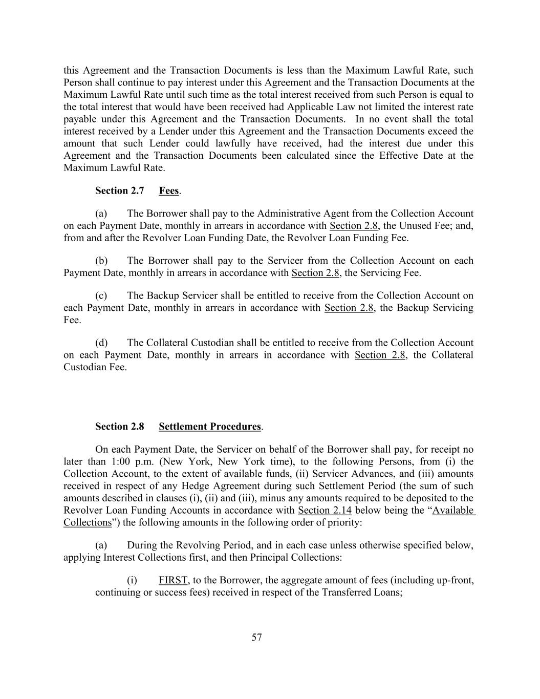 this Agreement and the Transaction Documents is less than the Maximum Lawful Rate, such Person shall continue to pay interest under this Agreement and the Transaction Documents at the Maximum Lawful Rate until such time as the total interest received from such Person is equal to the total interest that would have been received had Applicable Law not limited the interest rate payable under this Agreement and the Transaction Documents. In no event shall the total interest received by a Lender under this Agreement and the Transaction Documents exceed the amount that such Lender could lawfully have received, had the interest due under this Agreement and the Transaction Documents been calculated since the Effective Date at the Maximum Lawful Rate. Section 2.7 Fees. (a) The Borrower shall pay to the Administrative Agent from the Collection Account on each Payment Date, monthly in arrears in accordance with Section 2.8, the Unused Fee; and, from and after the Revolver Loan Funding Date, the Revolver Loan Funding Fee. (b) The Borrower shall pay to the Servicer from the Collection Account on each Payment Date, monthly in arrears in accordance with Section 2.8, the Servicing Fee. (c) The Backup Servicer shall be entitled to receive from the Collection Account on each Payment Date, monthly in arrears in accordance with Section 2.8, the Backup Servicing Fee. (d) The Collateral Custodian shall be entitled to receive from the Collection Account on each Payment Date, monthly in arrears in accordance with Section 2.8, the Collateral Custodian Fee. Section 2.8 Settlement Procedures. On each Payment Date, the Servicer on behalf of the Borrower shall pay, for receipt no later than 1:00 p.m. (New York, New York time), to the following Persons, from (i) the Collection Account, to the extent of available funds, (ii) Servicer Advances, and (iii) amounts received in respect of any Hedge Agreement during such Settlement Period (the sum of such amounts described in clauses (i), (ii) and (iii), minus any amounts required to be deposited to the Revolver Loan Funding Accounts in accordance with Section 2.14 below being the “Available Collections”) the following amounts in the following order of priority: (a) During the Revolving Period, and in each case unless otherwise specified below, applying Interest Collections first, and then Principal Collections: (i) FIRST, to the Borrower, the aggregate amount of fees (including up-front, continuing or success fees) received in respect of the Transferred Loans; 57