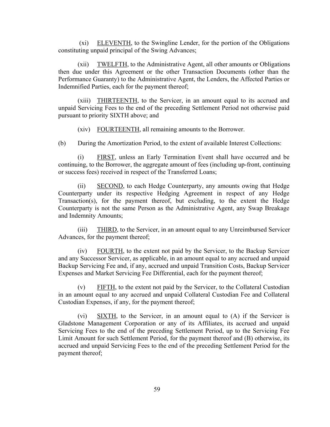 (xi) ELEVENTH, to the Swingline Lender, for the portion of the Obligations constituting unpaid principal of the Swing Advances; (xii) TWELFTH, to the Administrative Agent, all other amounts or Obligations then due under this Agreement or the other Transaction Documents (other than the Performance Guaranty) to the Administrative Agent, the Lenders, the Affected Parties or Indemnified Parties, each for the payment thereof; (xiii) THIRTEENTH, to the Servicer, in an amount equal to its accrued and unpaid Servicing Fees to the end of the preceding Settlement Period not otherwise paid pursuant to priority SIXTH above; and (xiv) FOURTEENTH, all remaining amounts to the Borrower. (b) During the Amortization Period, to the extent of available Interest Collections: (i) FIRST, unless an Early Termination Event shall have occurred and be continuing, to the Borrower, the aggregate amount of fees (including up-front, continuing or success fees) received in respect of the Transferred Loans; (ii) SECOND, to each Hedge Counterparty, any amounts owing that Hedge Counterparty under its respective Hedging Agreement in respect of any Hedge Transaction(s), for the payment thereof, but excluding, to the extent the Hedge Counterparty is not the same Person as the Administrative Agent, any Swap Breakage and Indemnity Amounts; (iii) THIRD, to the Servicer, in an amount equal to any Unreimbursed Servicer Advances, for the payment thereof; (iv) FOURTH, to the extent not paid by the Servicer, to the Backup Servicer and any Successor Servicer, as applicable, in an amount equal to any accrued and unpaid Backup Servicing Fee and, if any, accrued and unpaid Transition Costs, Backup Servicer Expenses and Market Servicing Fee Differential, each for the payment thereof; (v) FIFTH, to the extent not paid by the Servicer, to the Collateral Custodian in an amount equal to any accrued and unpaid Collateral Custodian Fee and Collateral Custodian Expenses, if any, for the payment thereof; (vi) SIXTH, to the Servicer, in an amount equal to (A) if the Servicer is Gladstone Management Corporation or any of its Affiliates, its accrued and unpaid Servicing Fees to the end of the preceding Settlement Period, up to the Servicing Fee Limit Amount for such Settlement Period, for the payment thereof and (B) otherwise, its accrued and unpaid Servicing Fees to the end of the preceding Settlement Period for the payment thereof; 59
