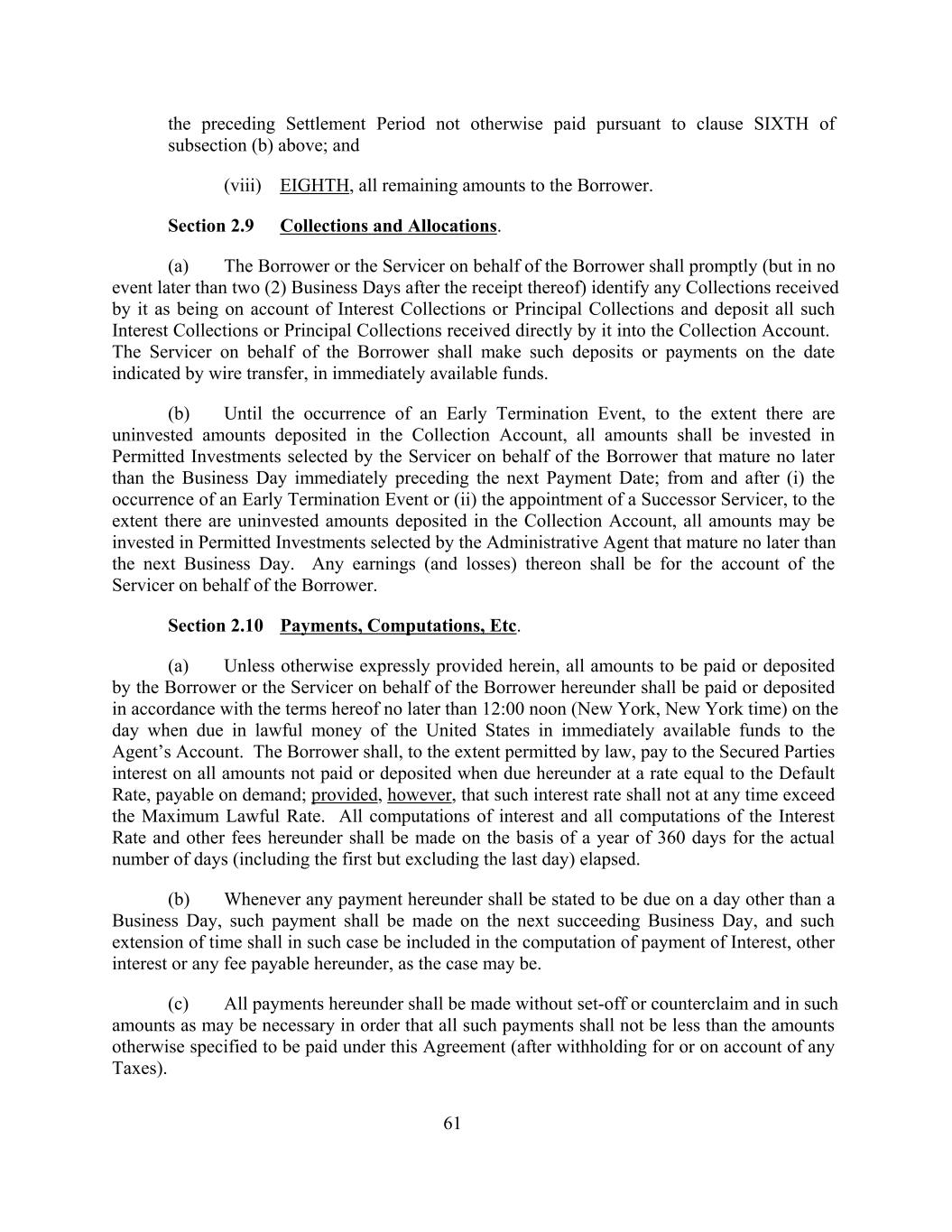 the preceding Settlement Period not otherwise paid pursuant to clause SIXTH of subsection (b) above; and (viii) EIGHTH, all remaining amounts to the Borrower. Section 2.9 Collections and Allocations. (a) The Borrower or the Servicer on behalf of the Borrower shall promptly (but in no event later than two (2) Business Days after the receipt thereof) identify any Collections received by it as being on account of Interest Collections or Principal Collections and deposit all such Interest Collections or Principal Collections received directly by it into the Collection Account. The Servicer on behalf of the Borrower shall make such deposits or payments on the date indicated by wire transfer, in immediately available funds. (b) Until the occurrence of an Early Termination Event, to the extent there are uninvested amounts deposited in the Collection Account, all amounts shall be invested in Permitted Investments selected by the Servicer on behalf of the Borrower that mature no later than the Business Day immediately preceding the next Payment Date; from and after (i) the occurrence of an Early Termination Event or (ii) the appointment of a Successor Servicer, to the extent there are uninvested amounts deposited in the Collection Account, all amounts may be invested in Permitted Investments selected by the Administrative Agent that mature no later than the next Business Day. Any earnings (and losses) thereon shall be for the account of the Servicer on behalf of the Borrower. Section 2.10 Payments, Computations, Etc. (a) Unless otherwise expressly provided herein, all amounts to be paid or deposited by the Borrower or the Servicer on behalf of the Borrower hereunder shall be paid or deposited in accordance with the terms hereof no later than 12:00 noon (New York, New York time) on the day when due in lawful money of the United States in immediately available funds to the Agent’s Account. The Borrower shall, to the extent permitted by law, pay to the Secured Parties interest on all amounts not paid or deposited when due hereunder at a rate equal to the Default Rate, payable on demand; provided, however, that such interest rate shall not at any time exceed the Maximum Lawful Rate. All computations of interest and all computations of the Interest Rate and other fees hereunder shall be made on the basis of a year of 360 days for the actual number of days (including the first but excluding the last day) elapsed. (b) Whenever any payment hereunder shall be stated to be due on a day other than a Business Day, such payment shall be made on the next succeeding Business Day, and such extension of time shall in such case be included in the computation of payment of Interest, other interest or any fee payable hereunder, as the case may be. (c) All payments hereunder shall be made without set-off or counterclaim and in such amounts as may be necessary in order that all such payments shall not be less than the amounts otherwise specified to be paid under this Agreement (after withholding for or on account of any Taxes). 61