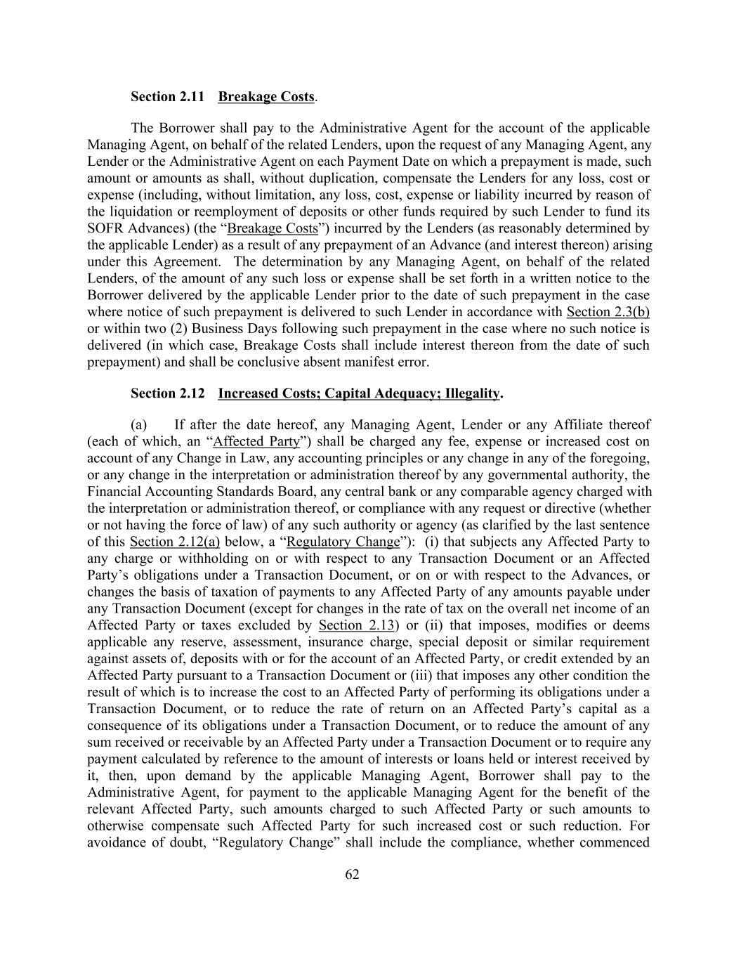 Section 2.11 Breakage Costs. The Borrower shall pay to the Administrative Agent for the account of the applicable Managing Agent, on behalf of the related Lenders, upon the request of any Managing Agent, any Lender or the Administrative Agent on each Payment Date on which a prepayment is made, such amount or amounts as shall, without duplication, compensate the Lenders for any loss, cost or expense (including, without limitation, any loss, cost, expense or liability incurred by reason of the liquidation or reemployment of deposits or other funds required by such Lender to fund its SOFR Advances) (the “Breakage Costs”) incurred by the Lenders (as reasonably determined by the applicable Lender) as a result of any prepayment of an Advance (and interest thereon) arising under this Agreement. The determination by any Managing Agent, on behalf of the related Lenders, of the amount of any such loss or expense shall be set forth in a written notice to the Borrower delivered by the applicable Lender prior to the date of such prepayment in the case where notice of such prepayment is delivered to such Lender in accordance with Section 2.3(b) or within two (2) Business Days following such prepayment in the case where no such notice is delivered (in which case, Breakage Costs shall include interest thereon from the date of such prepayment) and shall be conclusive absent manifest error. Section 2.12 Increased Costs; Capital Adequacy; Illegality. (a) If after the date hereof, any Managing Agent, Lender or any Affiliate thereof (each of which, an “Affected Party”) shall be charged any fee, expense or increased cost on account of any Change in Law, any accounting principles or any change in any of the foregoing, or any change in the interpretation or administration thereof by any governmental authority, the Financial Accounting Standards Board, any central bank or any comparable agency charged with the interpretation or administration thereof, or compliance with any request or directive (whether or not having the force of law) of any such authority or agency (as clarified by the last sentence of this Section 2.12(a) below, a “Regulatory Change”): (i) that subjects any Affected Party to any charge or withholding on or with respect to any Transaction Document or an Affected Party’s obligations under a Transaction Document, or on or with respect to the Advances, or changes the basis of taxation of payments to any Affected Party of any amounts payable under any Transaction Document (except for changes in the rate of tax on the overall net income of an Affected Party or taxes excluded by Section 2.13) or (ii) that imposes, modifies or deems applicable any reserve, assessment, insurance charge, special deposit or similar requirement against assets of, deposits with or for the account of an Affected Party, or credit extended by an Affected Party pursuant to a Transaction Document or (iii) that imposes any other condition the result of which is to increase the cost to an Affected Party of performing its obligations under a Transaction Document, or to reduce the rate of return on an Affected Party’s capital as a consequence of its obligations under a Transaction Document, or to reduce the amount of any sum received or receivable by an Affected Party under a Transaction Document or to require any payment calculated by reference to the amount of interests or loans held or interest received by it, then, upon demand by the applicable Managing Agent, Borrower shall pay to the Administrative Agent, for payment to the applicable Managing Agent for the benefit of the relevant Affected Party, such amounts charged to such Affected Party or such amounts to otherwise compensate such Affected Party for such increased cost or such reduction. For avoidance of doubt, “Regulatory Change” shall include the compliance, whether commenced 62