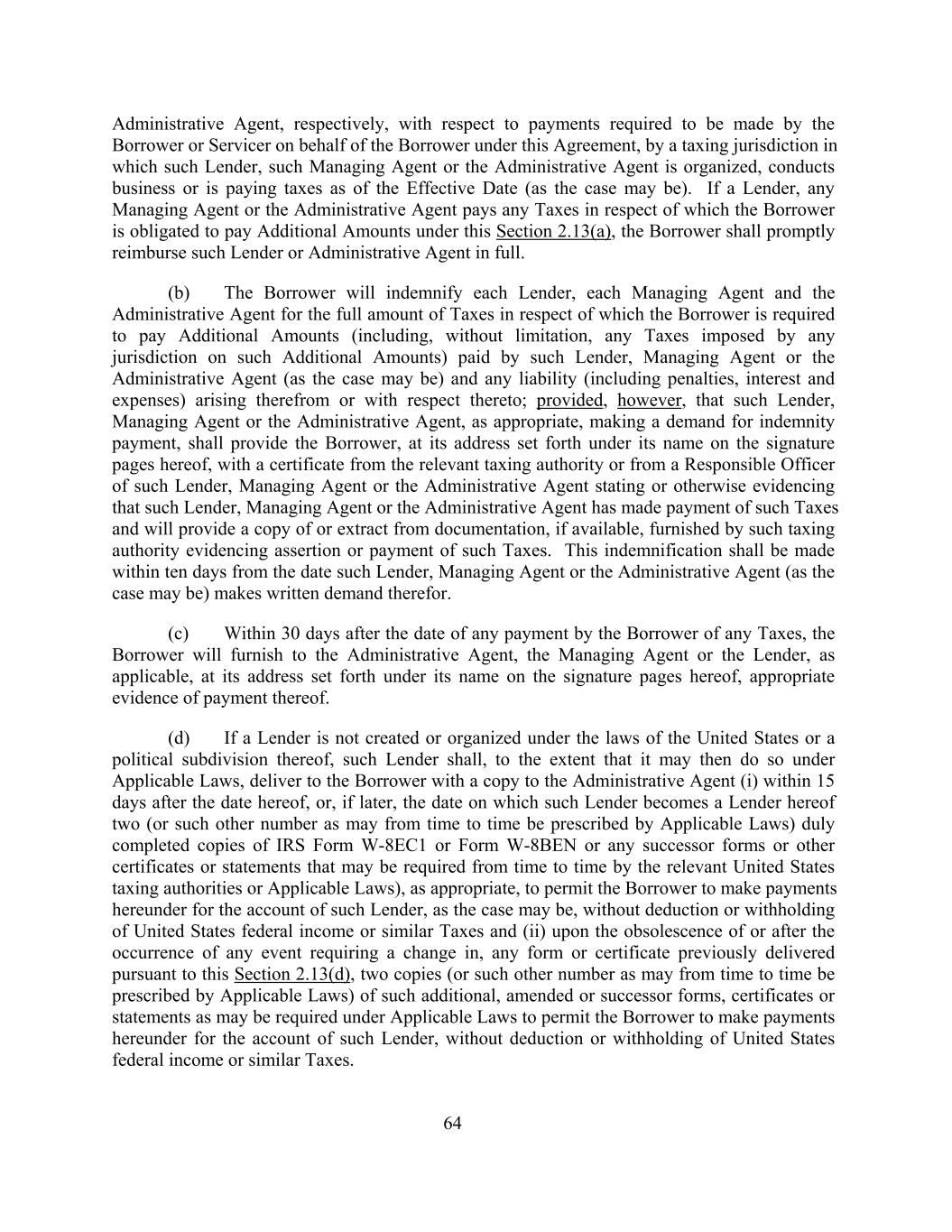Administrative Agent, respectively, with respect to payments required to be made by the Borrower or Servicer on behalf of the Borrower under this Agreement, by a taxing jurisdiction in which such Lender, such Managing Agent or the Administrative Agent is organized, conducts business or is paying taxes as of the Effective Date (as the case may be). If a Lender, any Managing Agent or the Administrative Agent pays any Taxes in respect of which the Borrower is obligated to pay Additional Amounts under this Section 2.13(a), the Borrower shall promptly reimburse such Lender or Administrative Agent in full. (b) The Borrower will indemnify each Lender, each Managing Agent and the Administrative Agent for the full amount of Taxes in respect of which the Borrower is required to pay Additional Amounts (including, without limitation, any Taxes imposed by any jurisdiction on such Additional Amounts) paid by such Lender, Managing Agent or the Administrative Agent (as the case may be) and any liability (including penalties, interest and expenses) arising therefrom or with respect thereto; provided, however, that such Lender, Managing Agent or the Administrative Agent, as appropriate, making a demand for indemnity payment, shall provide the Borrower, at its address set forth under its name on the signature pages hereof, with a certificate from the relevant taxing authority or from a Responsible Officer of such Lender, Managing Agent or the Administrative Agent stating or otherwise evidencing that such Lender, Managing Agent or the Administrative Agent has made payment of such Taxes and will provide a copy of or extract from documentation, if available, furnished by such taxing authority evidencing assertion or payment of such Taxes. This indemnification shall be made within ten days from the date such Lender, Managing Agent or the Administrative Agent (as the case may be) makes written demand therefor. (c) Within 30 days after the date of any payment by the Borrower of any Taxes, the Borrower will furnish to the Administrative Agent, the Managing Agent or the Lender, as applicable, at its address set forth under its name on the signature pages hereof, appropriate evidence of payment thereof. (d) If a Lender is not created or organized under the laws of the United States or a political subdivision thereof, such Lender shall, to the extent that it may then do so under Applicable Laws, deliver to the Borrower with a copy to the Administrative Agent (i) within 15 days after the date hereof, or, if later, the date on which such Lender becomes a Lender hereof two (or such other number as may from time to time be prescribed by Applicable Laws) duly completed copies of IRS Form W-8EC1 or Form W-8BEN or any successor forms or other certificates or statements that may be required from time to time by the relevant United States taxing authorities or Applicable Laws), as appropriate, to permit the Borrower to make payments hereunder for the account of such Lender, as the case may be, without deduction or withholding of United States federal income or similar Taxes and (ii) upon the obsolescence of or after the occurrence of any event requiring a change in, any form or certificate previously delivered pursuant to this Section 2.13(d), two copies (or such other number as may from time to time be prescribed by Applicable Laws) of such additional, amended or successor forms, certificates or statements as may be required under Applicable Laws to permit the Borrower to make payments hereunder for the account of such Lender, without deduction or withholding of United States federal income or similar Taxes. 64
