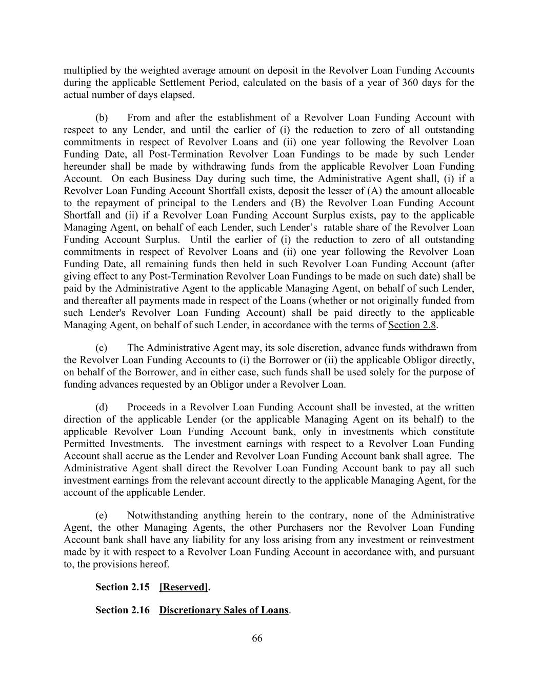 multiplied by the weighted average amount on deposit in the Revolver Loan Funding Accounts during the applicable Settlement Period, calculated on the basis of a year of 360 days for the actual number of days elapsed. (b) From and after the establishment of a Revolver Loan Funding Account with respect to any Lender, and until the earlier of (i) the reduction to zero of all outstanding commitments in respect of Revolver Loans and (ii) one year following the Revolver Loan Funding Date, all Post-Termination Revolver Loan Fundings to be made by such Lender hereunder shall be made by withdrawing funds from the applicable Revolver Loan Funding Account. On each Business Day during such time, the Administrative Agent shall, (i) if a Revolver Loan Funding Account Shortfall exists, deposit the lesser of (A) the amount allocable to the repayment of principal to the Lenders and (B) the Revolver Loan Funding Account Shortfall and (ii) if a Revolver Loan Funding Account Surplus exists, pay to the applicable Managing Agent, on behalf of each Lender, such Lender’s ratable share of the Revolver Loan Funding Account Surplus. Until the earlier of (i) the reduction to zero of all outstanding commitments in respect of Revolver Loans and (ii) one year following the Revolver Loan Funding Date, all remaining funds then held in such Revolver Loan Funding Account (after giving effect to any Post-Termination Revolver Loan Fundings to be made on such date) shall be paid by the Administrative Agent to the applicable Managing Agent, on behalf of such Lender, and thereafter all payments made in respect of the Loans (whether or not originally funded from such Lender's Revolver Loan Funding Account) shall be paid directly to the applicable Managing Agent, on behalf of such Lender, in accordance with the terms of Section 2.8. (c) The Administrative Agent may, its sole discretion, advance funds withdrawn from the Revolver Loan Funding Accounts to (i) the Borrower or (ii) the applicable Obligor directly, on behalf of the Borrower, and in either case, such funds shall be used solely for the purpose of funding advances requested by an Obligor under a Revolver Loan. (d) Proceeds in a Revolver Loan Funding Account shall be invested, at the written direction of the applicable Lender (or the applicable Managing Agent on its behalf) to the applicable Revolver Loan Funding Account bank, only in investments which constitute Permitted Investments. The investment earnings with respect to a Revolver Loan Funding Account shall accrue as the Lender and Revolver Loan Funding Account bank shall agree. The Administrative Agent shall direct the Revolver Loan Funding Account bank to pay all such investment earnings from the relevant account directly to the applicable Managing Agent, for the account of the applicable Lender. (e) Notwithstanding anything herein to the contrary, none of the Administrative Agent, the other Managing Agents, the other Purchasers nor the Revolver Loan Funding Account bank shall have any liability for any loss arising from any investment or reinvestment made by it with respect to a Revolver Loan Funding Account in accordance with, and pursuant to, the provisions hereof. Section 2.15 [Reserved]. Section 2.16 Discretionary Sales of Loans. 66