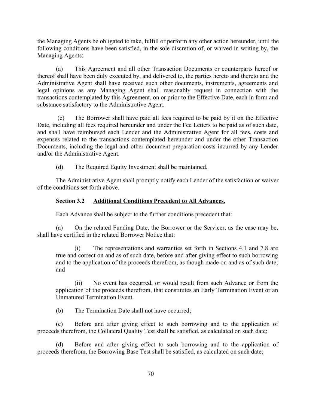 the Managing Agents be obligated to take, fulfill or perform any other action hereunder, until the following conditions have been satisfied, in the sole discretion of, or waived in writing by, the Managing Agents: (a) This Agreement and all other Transaction Documents or counterparts hereof or thereof shall have been duly executed by, and delivered to, the parties hereto and thereto and the Administrative Agent shall have received such other documents, instruments, agreements and legal opinions as any Managing Agent shall reasonably request in connection with the transactions contemplated by this Agreement, on or prior to the Effective Date, each in form and substance satisfactory to the Administrative Agent. (c) The Borrower shall have paid all fees required to be paid by it on the Effective Date, including all fees required hereunder and under the Fee Letters to be paid as of such date, and shall have reimbursed each Lender and the Administrative Agent for all fees, costs and expenses related to the transactions contemplated hereunder and under the other Transaction Documents, including the legal and other document preparation costs incurred by any Lender and/or the Administrative Agent. (d) The Required Equity Investment shall be maintained. The Administrative Agent shall promptly notify each Lender of the satisfaction or waiver of the conditions set forth above. Section 3.2 Additional Conditions Precedent to All Advances. Each Advance shall be subject to the further conditions precedent that: (a) On the related Funding Date, the Borrower or the Servicer, as the case may be, shall have certified in the related Borrower Notice that: (i) The representations and warranties set forth in Sections 4.1 and 7.8 are true and correct on and as of such date, before and after giving effect to such borrowing and to the application of the proceeds therefrom, as though made on and as of such date; and (ii) No event has occurred, or would result from such Advance or from the application of the proceeds therefrom, that constitutes an Early Termination Event or an Unmatured Termination Event. (b) The Termination Date shall not have occurred; (c) Before and after giving effect to such borrowing and to the application of proceeds therefrom, the Collateral Quality Test shall be satisfied, as calculated on such date; (d) Before and after giving effect to such borrowing and to the application of proceeds therefrom, the Borrowing Base Test shall be satisfied, as calculated on such date; 70
