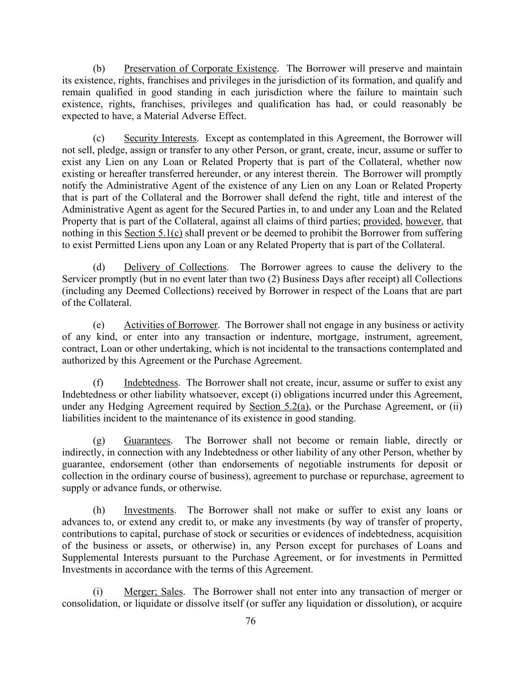 (b) Preservation of Corporate Existence. The Borrower will preserve and maintain its existence, rights, franchises and privileges in the jurisdiction of its formation, and qualify and remain qualified in good standing in each jurisdiction where the failure to maintain such existence, rights, franchises, privileges and qualification has had, or could reasonably be expected to have, a Material Adverse Effect. (c) Security Interests. Except as contemplated in this Agreement, the Borrower will not sell, pledge, assign or transfer to any other Person, or grant, create, incur, assume or suffer to exist any Lien on any Loan or Related Property that is part of the Collateral, whether now existing or hereafter transferred hereunder, or any interest therein. The Borrower will promptly notify the Administrative Agent of the existence of any Lien on any Loan or Related Property that is part of the Collateral and the Borrower shall defend the right, title and interest of the Administrative Agent as agent for the Secured Parties in, to and under any Loan and the Related Property that is part of the Collateral, against all claims of third parties; provided, however, that nothing in this Section 5.1(c) shall prevent or be deemed to prohibit the Borrower from suffering to exist Permitted Liens upon any Loan or any Related Property that is part of the Collateral. (d) Delivery of Collections. The Borrower agrees to cause the delivery to the Servicer promptly (but in no event later than two (2) Business Days after receipt) all Collections (including any Deemed Collections) received by Borrower in respect of the Loans that are part of the Collateral. (e) Activities of Borrower. The Borrower shall not engage in any business or activity of any kind, or enter into any transaction or indenture, mortgage, instrument, agreement, contract, Loan or other undertaking, which is not incidental to the transactions contemplated and authorized by this Agreement or the Purchase Agreement. (f) Indebtedness. The Borrower shall not create, incur, assume or suffer to exist any Indebtedness or other liability whatsoever, except (i) obligations incurred under this Agreement, under any Hedging Agreement required by Section 5.2(a), or the Purchase Agreement, or (ii) liabilities incident to the maintenance of its existence in good standing. (g) Guarantees. The Borrower shall not become or remain liable, directly or indirectly, in connection with any Indebtedness or other liability of any other Person, whether by guarantee, endorsement (other than endorsements of negotiable instruments for deposit or collection in the ordinary course of business), agreement to purchase or repurchase, agreement to supply or advance funds, or otherwise. (h) Investments. The Borrower shall not make or suffer to exist any loans or advances to, or extend any credit to, or make any investments (by way of transfer of property, contributions to capital, purchase of stock or securities or evidences of indebtedness, acquisition of the business or assets, or otherwise) in, any Person except for purchases of Loans and Supplemental Interests pursuant to the Purchase Agreement, or for investments in Permitted Investments in accordance with the terms of this Agreement. (i) Merger; Sales. The Borrower shall not enter into any transaction of merger or consolidation, or liquidate or dissolve itself (or suffer any liquidation or dissolution), or acquire 76