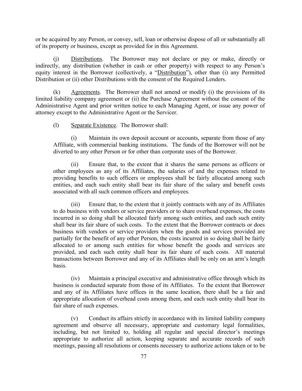 or be acquired by any Person, or convey, sell, loan or otherwise dispose of all or substantially all of its property or business, except as provided for in this Agreement. (j) Distributions. The Borrower may not declare or pay or make, directly or indirectly, any distribution (whether in cash or other property) with respect to any Person’s equity interest in the Borrower (collectively, a “Distribution”), other than (i) any Permitted Distribution or (ii) other Distributions with the consent of the Required Lenders. (k) Agreements. The Borrower shall not amend or modify (i) the provisions of its limited liability company agreement or (ii) the Purchase Agreement without the consent of the Administrative Agent and prior written notice to each Managing Agent, or issue any power of attorney except to the Administrative Agent or the Servicer. (l) Separate Existence. The Borrower shall: (i) Maintain its own deposit account or accounts, separate from those of any Affiliate, with commercial banking institutions. The funds of the Borrower will not be diverted to any other Person or for other than corporate uses of the Borrower. (ii) Ensure that, to the extent that it shares the same persons as officers or other employees as any of its Affiliates, the salaries of and the expenses related to providing benefits to such officers or employees shall be fairly allocated among such entities, and each such entity shall bear its fair share of the salary and benefit costs associated with all such common officers and employees. (iii) Ensure that, to the extent that it jointly contracts with any of its Affiliates to do business with vendors or service providers or to share overhead expenses, the costs incurred in so doing shall be allocated fairly among such entities, and each such entity shall bear its fair share of such costs. To the extent that the Borrower contracts or does business with vendors or service providers when the goods and services provided are partially for the benefit of any other Person, the costs incurred in so doing shall be fairly allocated to or among such entities for whose benefit the goods and services are provided, and each such entity shall bear its fair share of such costs. All material transactions between Borrower and any of its Affiliates shall be only on an arm’s length basis. (iv) Maintain a principal executive and administrative office through which its business is conducted separate from those of its Affiliates. To the extent that Borrower and any of its Affiliates have offices in the same location, there shall be a fair and appropriate allocation of overhead costs among them, and each such entity shall bear its fair share of such expenses. (v) Conduct its affairs strictly in accordance with its limited liability company agreement and observe all necessary, appropriate and customary legal formalities, including, but not limited to, holding all regular and special director’s meetings appropriate to authorize all action, keeping separate and accurate records of such meetings, passing all resolutions or consents necessary to authorize actions taken or to be 77