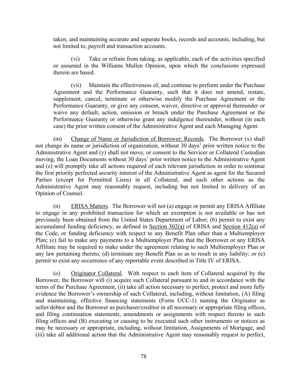 taken, and maintaining accurate and separate books, records and accounts, including, but not limited to, payroll and transaction accounts. (vi) Take or refrain from taking, as applicable, each of the activities specified or assumed in the Williams Mullen Opinion, upon which the conclusions expressed therein are based. (vii) Maintain the effectiveness of, and continue to perform under the Purchase Agreement and the Performance Guaranty, such that it does not amend, restate, supplement, cancel, terminate or otherwise modify the Purchase Agreement or the Performance Guaranty, or give any consent, waiver, directive or approval thereunder or waive any default, action, omission or breach under the Purchase Agreement or the Performance Guaranty or otherwise grant any indulgence thereunder, without (in each case) the prior written consent of the Administrative Agent and each Managing Agent. (m) Change of Name or Jurisdiction of Borrower; Records. The Borrower (x) shall not change its name or jurisdiction of organization, without 30 days’ prior written notice to the Administrative Agent and (y) shall not move, or consent to the Servicer or Collateral Custodian moving, the Loan Documents without 30 days’ prior written notice to the Administrative Agent and (z) will promptly take all actions required of each relevant jurisdiction in order to continue the first priority perfected security interest of the Administrative Agent as agent for the Secured Parties (except for Permitted Liens) in all Collateral, and such other actions as the Administrative Agent may reasonably request, including but not limited to delivery of an Opinion of Counsel. (n) ERISA Matters. The Borrower will not (a) engage or permit any ERISA Affiliate to engage in any prohibited transaction for which an exemption is not available or has not previously been obtained from the United States Department of Labor; (b) permit to exist any accumulated funding deficiency, as defined in Section 302(a) of ERISA and Section 412(a) of the Code, or funding deficiency with respect to any Benefit Plan other than a Multiemployer Plan; (c) fail to make any payments to a Multiemployer Plan that the Borrower or any ERISA Affiliate may be required to make under the agreement relating to such Multiemployer Plan or any law pertaining thereto; (d) terminate any Benefit Plan so as to result in any liability; or (e) permit to exist any occurrence of any reportable event described in Title IV of ERISA. (o) Originator Collateral. With respect to each item of Collateral acquired by the Borrower, the Borrower will (i) acquire such Collateral pursuant to and in accordance with the terms of the Purchase Agreement, (ii) take all action necessary to perfect, protect and more fully evidence the Borrower’s ownership of such Collateral, including, without limitation, (A) filing and maintaining, effective financing statements (Form UCC-1) naming the Originator as seller/debtor and the Borrower as purchaser/creditor in all necessary or appropriate filing offices, and filing continuation statements, amendments or assignments with respect thereto in such filing offices and (B) executing or causing to be executed such other instruments or notices as may be necessary or appropriate, including, without limitation, Assignments of Mortgage, and (iii) take all additional action that the Administrative Agent may reasonably request to perfect, 78