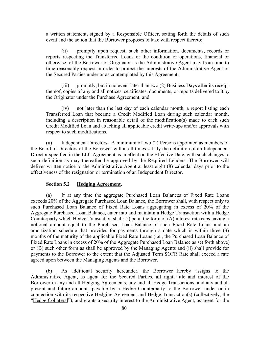 a written statement, signed by a Responsible Officer, setting forth the details of such event and the action that the Borrower proposes to take with respect thereto; (ii) promptly upon request, such other information, documents, records or reports respecting the Transferred Loans or the condition or operations, financial or otherwise, of the Borrower or Originator as the Administrative Agent may from time to time reasonably request in order to protect the interests of the Administrative Agent or the Secured Parties under or as contemplated by this Agreement; (iii) promptly, but in no event later than two (2) Business Days after its receipt thereof, copies of any and all notices, certificates, documents, or reports delivered to it by the Originator under the Purchase Agreement; and (iv) not later than the last day of each calendar month, a report listing each Transferred Loan that became a Credit Modified Loan during such calendar month, including a description in reasonable detail of the modification(s) made to each such Credit Modified Loan and attaching all applicable credit write-ups and/or approvals with respect to such modifications. (u) Independent Directors. A minimum of two (2) Persons appointed as members of the Board of Directors of the Borrower will at all times satisfy the definition of an Independent Director specified in the LLC Agreement as in effect on the Effective Date, with such changes to such definition as may thereafter be approved by the Required Lenders. The Borrower will deliver written notice to the Administrative Agent at least eight (8) calendar days prior to the effectiveness of the resignation or termination of an Independent Director. Section 5.2 Hedging Agreement. (a) If at any time the aggregate Purchased Loan Balances of Fixed Rate Loans exceeds 20% of the Aggregate Purchased Loan Balance, the Borrower shall, with respect only to such Purchased Loan Balance of Fixed Rate Loans aggregating in excess of 20% of the Aggregate Purchased Loan Balance, enter into and maintain a Hedge Transaction with a Hedge Counterparty which Hedge Transaction shall: (i) be in the form of (A) interest rate caps having a notional amount equal to the Purchased Loan Balance of such Fixed Rate Loans and an amortization schedule that provides for payments through a date which is within three (3) months of the maturity of the applicable Fixed Rate Loans (i.e., the Purchased Loan Balance of Fixed Rate Loans in excess of 20% of the Aggregate Purchased Loan Balance as set forth above) or (B) such other form as shall be approved by the Managing Agents and (ii) shall provide for payments to the Borrower to the extent that the Adjusted Term SOFR Rate shall exceed a rate agreed upon between the Managing Agents and the Borrower. (b) As additional security hereunder, the Borrower hereby assigns to the Administrative Agent, as agent for the Secured Parties, all right, title and interest of the Borrower in any and all Hedging Agreements, any and all Hedge Transactions, and any and all present and future amounts payable by a Hedge Counterparty to the Borrower under or in connection with its respective Hedging Agreement and Hedge Transaction(s) (collectively, the “Hedge Collateral”), and grants a security interest to the Administrative Agent, as agent for the 80