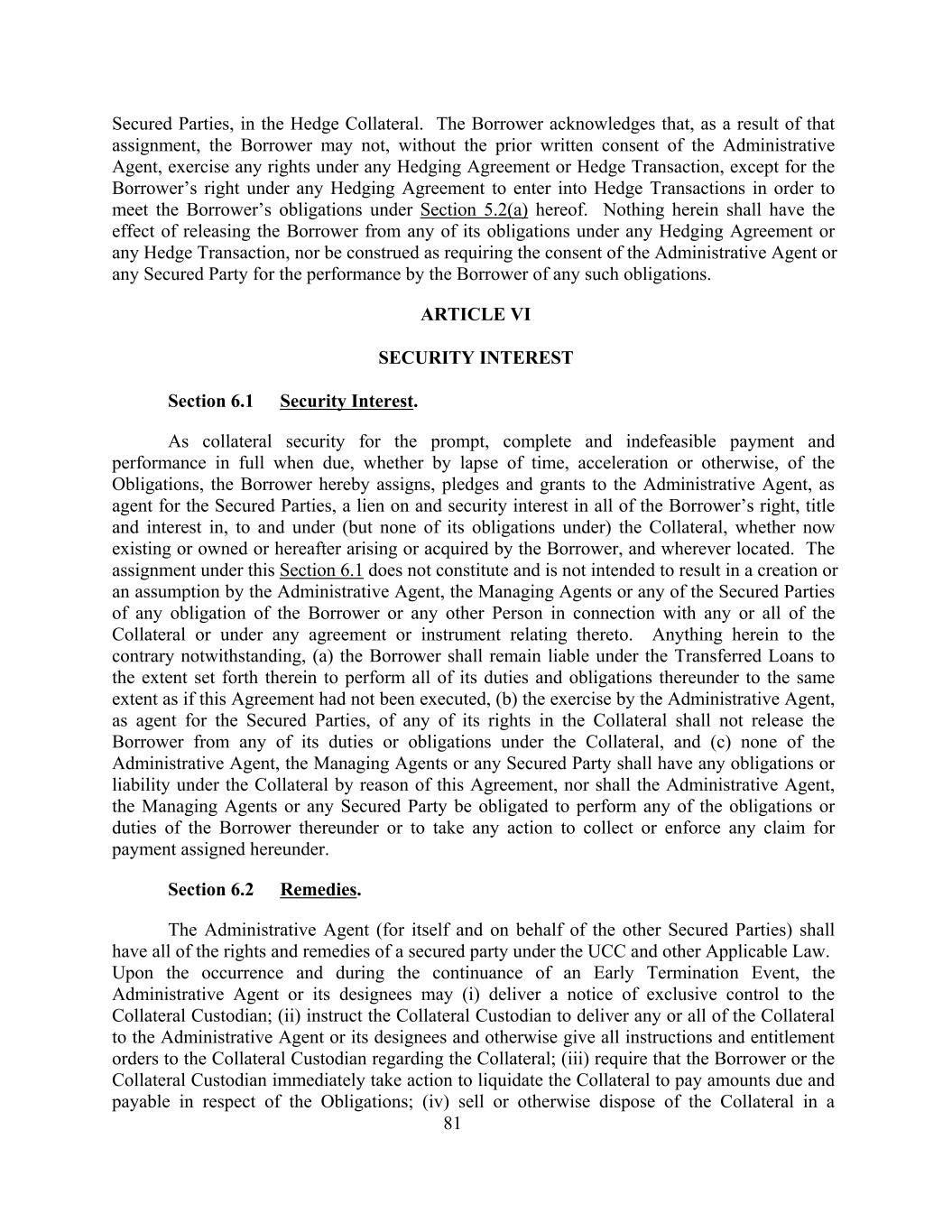 Secured Parties, in the Hedge Collateral. The Borrower acknowledges that, as a result of that assignment, the Borrower may not, without the prior written consent of the Administrative Agent, exercise any rights under any Hedging Agreement or Hedge Transaction, except for the Borrower’s right under any Hedging Agreement to enter into Hedge Transactions in order to meet the Borrower’s obligations under Section 5.2(a) hereof. Nothing herein shall have the effect of releasing the Borrower from any of its obligations under any Hedging Agreement or any Hedge Transaction, nor be construed as requiring the consent of the Administrative Agent or any Secured Party for the performance by the Borrower of any such obligations. ARTICLE VI SECURITY INTEREST Section 6.1 Security Interest. As collateral security for the prompt, complete and indefeasible payment and performance in full when due, whether by lapse of time, acceleration or otherwise, of the Obligations, the Borrower hereby assigns, pledges and grants to the Administrative Agent, as agent for the Secured Parties, a lien on and security interest in all of the Borrower’s right, title and interest in, to and under (but none of its obligations under) the Collateral, whether now existing or owned or hereafter arising or acquired by the Borrower, and wherever located. The assignment under this Section 6.1 does not constitute and is not intended to result in a creation or an assumption by the Administrative Agent, the Managing Agents or any of the Secured Parties of any obligation of the Borrower or any other Person in connection with any or all of the Collateral or under any agreement or instrument relating thereto. Anything herein to the contrary notwithstanding, (a) the Borrower shall remain liable under the Transferred Loans to the extent set forth therein to perform all of its duties and obligations thereunder to the same extent as if this Agreement had not been executed, (b) the exercise by the Administrative Agent, as agent for the Secured Parties, of any of its rights in the Collateral shall not release the Borrower from any of its duties or obligations under the Collateral, and (c) none of the Administrative Agent, the Managing Agents or any Secured Party shall have any obligations or liability under the Collateral by reason of this Agreement, nor shall the Administrative Agent, the Managing Agents or any Secured Party be obligated to perform any of the obligations or duties of the Borrower thereunder or to take any action to collect or enforce any claim for payment assigned hereunder. Section 6.2 Remedies. The Administrative Agent (for itself and on behalf of the other Secured Parties) shall have all of the rights and remedies of a secured party under the UCC and other Applicable Law. Upon the occurrence and during the continuance of an Early Termination Event, the Administrative Agent or its designees may (i) deliver a notice of exclusive control to the Collateral Custodian; (ii) instruct the Collateral Custodian to deliver any or all of the Collateral to the Administrative Agent or its designees and otherwise give all instructions and entitlement orders to the Collateral Custodian regarding the Collateral; (iii) require that the Borrower or the Collateral Custodian immediately take action to liquidate the Collateral to pay amounts due and payable in respect of the Obligations; (iv) sell or otherwise dispose of the Collateral in a 81