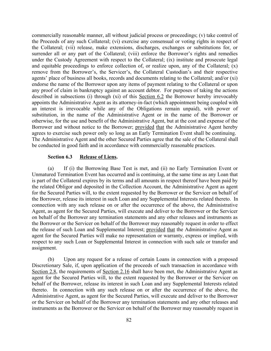 commercially reasonable manner, all without judicial process or proceedings; (v) take control of the Proceeds of any such Collateral; (vi) exercise any consensual or voting rights in respect of the Collateral; (vii) release, make extensions, discharges, exchanges or substitutions for, or surrender all or any part of the Collateral; (viii) enforce the Borrower’s rights and remedies under the Custody Agreement with respect to the Collateral; (ix) institute and prosecute legal and equitable proceedings to enforce collection of, or realize upon, any of the Collateral; (x) remove from the Borrower’s, the Servicer’s, the Collateral Custodian’s and their respective agents’ place of business all books, records and documents relating to the Collateral; and/or (xi) endorse the name of the Borrower upon any items of payment relating to the Collateral or upon any proof of claim in bankruptcy against an account debtor. For purposes of taking the actions described in subsections (i) through (xi) of this Section 6.2 the Borrower hereby irrevocably appoints the Administrative Agent as its attorney-in-fact (which appointment being coupled with an interest is irrevocable while any of the Obligations remain unpaid), with power of substitution, in the name of the Administrative Agent or in the name of the Borrower or otherwise, for the use and benefit of the Administrative Agent, but at the cost and expense of the Borrower and without notice to the Borrower; provided that the Administrative Agent hereby agrees to exercise such power only so long as an Early Termination Event shall be continuing. The Administrative Agent and the other Secured Parties agree that the sale of the Collateral shall be conducted in good faith and in accordance with commercially reasonable practices. Section 6.3 Release of Liens. (a) If (i) the Borrowing Base Test is met, and (ii) no Early Termination Event or Unmatured Termination Event has occurred and is continuing, at the same time as any Loan that is part of the Collateral expires by its terms and all amounts in respect thereof have been paid by the related Obligor and deposited in the Collection Account, the Administrative Agent as agent for the Secured Parties will, to the extent requested by the Borrower or the Servicer on behalf of the Borrower, release its interest in such Loan and any Supplemental Interests related thereto. In connection with any such release on or after the occurrence of the above, the Administrative Agent, as agent for the Secured Parties, will execute and deliver to the Borrower or the Servicer on behalf of the Borrower any termination statements and any other releases and instruments as the Borrower or the Servicer on behalf of the Borrower may reasonably request in order to effect the release of such Loan and Supplemental Interest; provided that the Administrative Agent as agent for the Secured Parties will make no representation or warranty, express or implied, with respect to any such Loan or Supplemental Interest in connection with such sale or transfer and assignment. (b) Upon any request for a release of certain Loans in connection with a proposed Discretionary Sale, if, upon application of the proceeds of such transaction in accordance with Section 2.8, the requirements of Section 2.16 shall have been met, the Administrative Agent as agent for the Secured Parties will, to the extent requested by the Borrower or the Servicer on behalf of the Borrower, release its interest in such Loan and any Supplemental Interests related thereto. In connection with any such release on or after the occurrence of the above, the Administrative Agent, as agent for the Secured Parties, will execute and deliver to the Borrower or the Servicer on behalf of the Borrower any termination statements and any other releases and instruments as the Borrower or the Servicer on behalf of the Borrower may reasonably request in 82