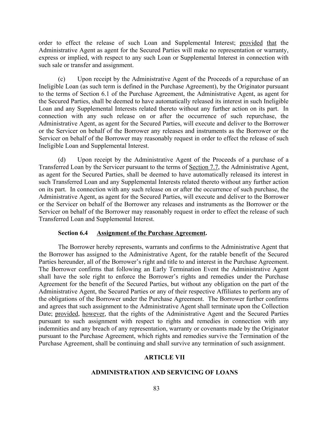 order to effect the release of such Loan and Supplemental Interest; provided that the Administrative Agent as agent for the Secured Parties will make no representation or warranty, express or implied, with respect to any such Loan or Supplemental Interest in connection with such sale or transfer and assignment. (c) Upon receipt by the Administrative Agent of the Proceeds of a repurchase of an Ineligible Loan (as such term is defined in the Purchase Agreement), by the Originator pursuant to the terms of Section 6.1 of the Purchase Agreement, the Administrative Agent, as agent for the Secured Parties, shall be deemed to have automatically released its interest in such Ineligible Loan and any Supplemental Interests related thereto without any further action on its part. In connection with any such release on or after the occurrence of such repurchase, the Administrative Agent, as agent for the Secured Parties, will execute and deliver to the Borrower or the Servicer on behalf of the Borrower any releases and instruments as the Borrower or the Servicer on behalf of the Borrower may reasonably request in order to effect the release of such Ineligible Loan and Supplemental Interest. (d) Upon receipt by the Administrative Agent of the Proceeds of a purchase of a Transferred Loan by the Servicer pursuant to the terms of Section 7.7, the Administrative Agent, as agent for the Secured Parties, shall be deemed to have automatically released its interest in such Transferred Loan and any Supplemental Interests related thereto without any further action on its part. In connection with any such release on or after the occurrence of such purchase, the Administrative Agent, as agent for the Secured Parties, will execute and deliver to the Borrower or the Servicer on behalf of the Borrower any releases and instruments as the Borrower or the Servicer on behalf of the Borrower may reasonably request in order to effect the release of such Transferred Loan and Supplemental Interest. Section 6.4 Assignment of the Purchase Agreement. The Borrower hereby represents, warrants and confirms to the Administrative Agent that the Borrower has assigned to the Administrative Agent, for the ratable benefit of the Secured Parties hereunder, all of the Borrower’s right and title to and interest in the Purchase Agreement. The Borrower confirms that following an Early Termination Event the Administrative Agent shall have the sole right to enforce the Borrower’s rights and remedies under the Purchase Agreement for the benefit of the Secured Parties, but without any obligation on the part of the Administrative Agent, the Secured Parties or any of their respective Affiliates to perform any of the obligations of the Borrower under the Purchase Agreement. The Borrower further confirms and agrees that such assignment to the Administrative Agent shall terminate upon the Collection Date; provided, however, that the rights of the Administrative Agent and the Secured Parties pursuant to such assignment with respect to rights and remedies in connection with any indemnities and any breach of any representation, warranty or covenants made by the Originator pursuant to the Purchase Agreement, which rights and remedies survive the Termination of the Purchase Agreement, shall be continuing and shall survive any termination of such assignment. ARTICLE VII ADMINISTRATION AND SERVICING OF LOANS 83